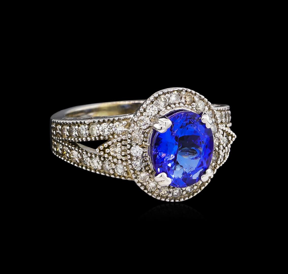 One electronically tested 14KT white gold Ladies combination cast & assembled ring with a bright polish finish. Condition is new. Identified with markings of "K14". Containing: One prong set oval modified brilliant cut natural tanzanite, measuring 9.40 x 8.00 x 5.20mm, approximate weight of 2.64ct., clarity is eye clean, type I, medium, moderately strong, bluish violet color, (GIA bV 5/4), cut is good. Colored gemstones are presumed to have been subjected to commonly used color/clarity enhancement processes. Fifty-One prong set round brilliant cut diamonds, measuring 1.50 - 1.50 x 0.90mm (depth est.) approximate. Total Weight of 51 Stones = 0.63ct. Clarity: I-1 to I-2. Color: I - J, Cut is Good. Total Weight of Colored Stones 2.64ct. Total Weight of Diamonds 0.63ct. Total Weight of Ring 7.20 grams. GGL Appraised at $6,955.00.
