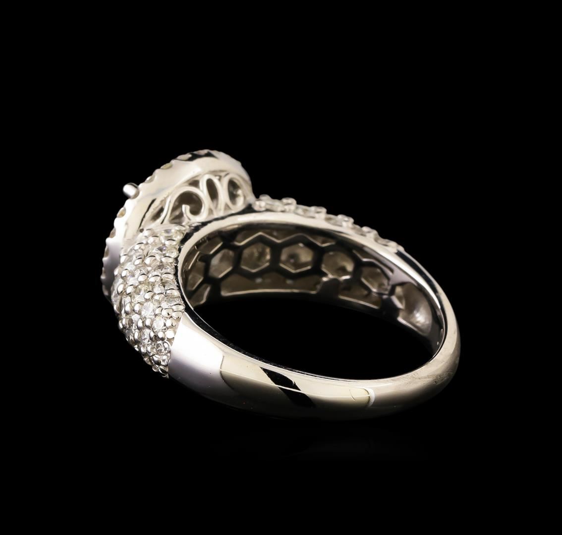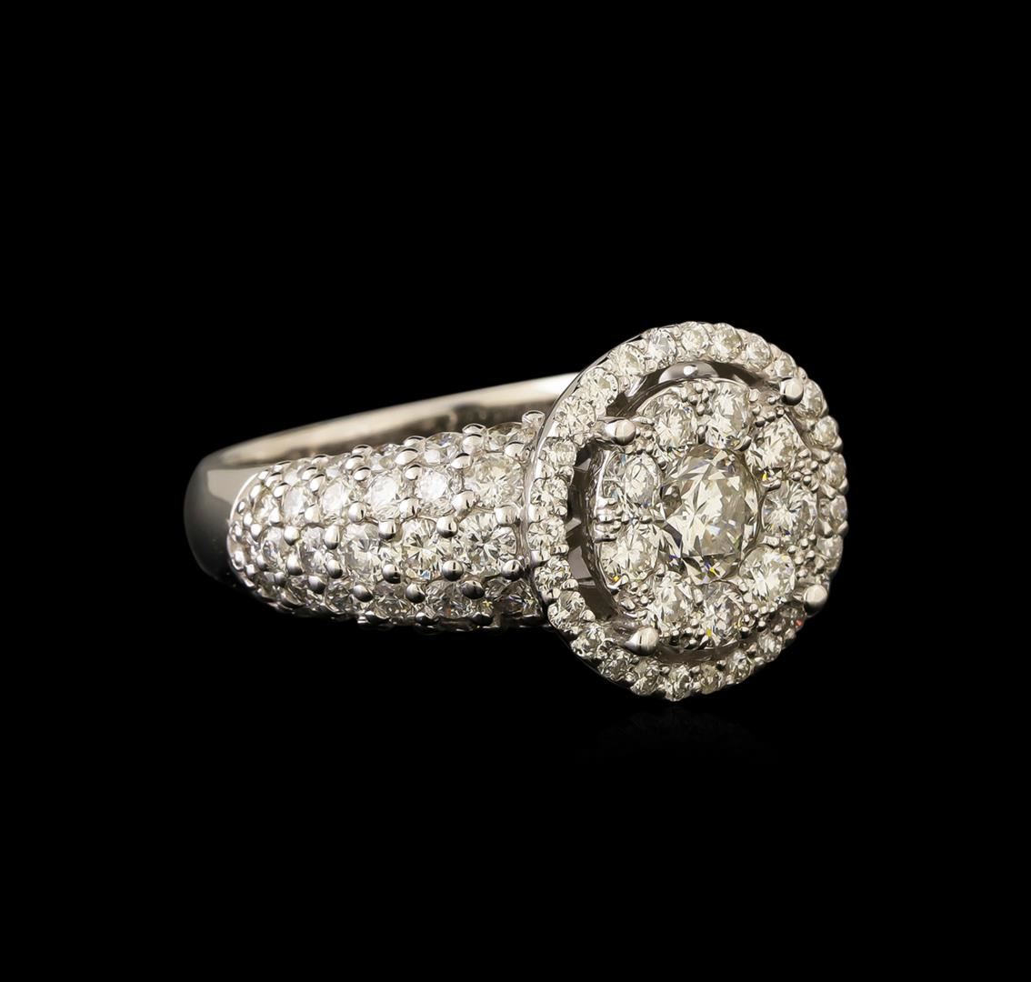 One electronically tested 14KT white gold ladies cast diamond ring with a bright polish finish. The ring features an organized diamond cluster set within a diamond bezel supported by diamond set shoulders, completed by a three millimeter wide band. Identified with markings of "14K". Condition is new, good workmanship. Containing: One prong set round brilliant cut diamond, measuring 4.90 - 4.80 x 3.00mm (depth est.) approximate weight of 0.45ct. Graded in the setting. Clarity: I-1. Color: H Sixty-Five prong set round brilliant cut diamonds, measuring 2.00 - 1.90 x 1.17mm (depth est.) approximate total weight of 65 Stones = 1.85ct. Graded in the setting. Clarity: SI-1 to I-1. Color: G - I Twenty-Seven prong set round brilliant cut diamonds, measuring 1.40 - 1.30 x 0.81mm (depth est.) approximate total weight of 27 Stones = 0.35ct. Graded in the setting. Clarity: SI-1 to I-1. Color: G - I. Total Weight of Diamonds 2.65ct. Total Weight of Ring 6.61 grams. AIG Appraised at $9,040.00.