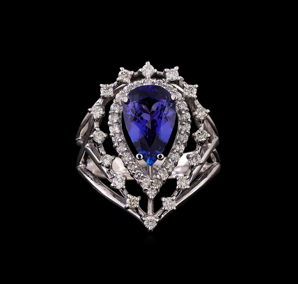 One electronically tested 14KT white gold ladies cast tanzanite and diamond ring with a bright polish finish. Identified with markings of "K14". Condition is new. Containing: One prong set pear modified brilliant cut natural tanzanite, measuring 11.13 x 7.20 x 4.93mm, approximate weight of 2.65ct., clarity is eye clean, type I, medium, very slightly grayish, violet color, (GIA V 5/3), cut is good. Fifty-Four prong set round brilliant cut diamonds, measuring 1.80 - 1.30 x 0.93mm (depth est.) approximate total weight of 54 Stones = 0.73ct. Clarity: SI-2 to I-1. Color: H - I, Cut is Good. Colored gemstones are presumed to have been subjected to commonly used enhancement processes. All diamonds and colored gemstones are graded in the mounting, unless otherwise stated. Total Weight of Colored Stones 2.65ct. Total Weight of Diamonds 0.73ct. Total Weight of Ring 6.70 grams. GGL Appraised at $5,490.00.