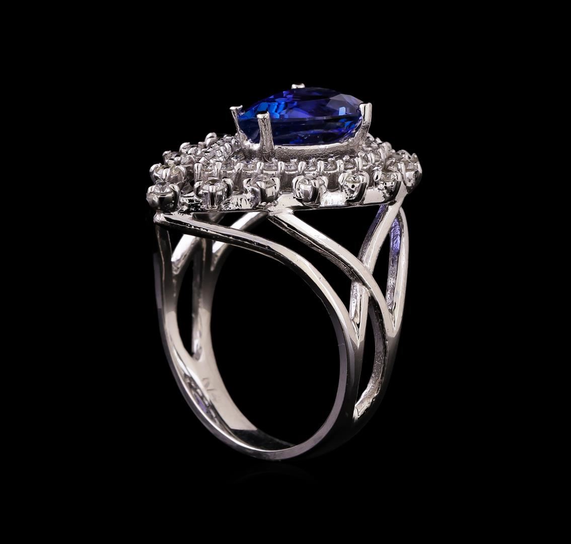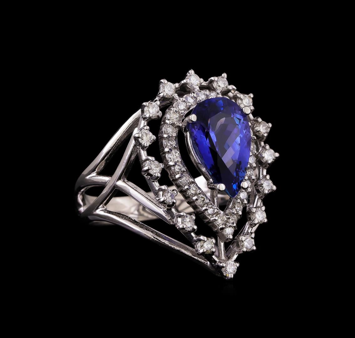 One electronically tested 14KT white gold ladies cast tanzanite and diamond ring with a bright polish finish. Identified with markings of "K14". Condition is new. Containing: One prong set pear modified brilliant cut natural tanzanite, measuring 11.13 x 7.20 x 4.93mm, approximate weight of 2.65ct., clarity is eye clean, type I, medium, very slightly grayish, violet color, (GIA V 5/3), cut is good. Fifty-Four prong set round brilliant cut diamonds, measuring 1.80 - 1.30 x 0.93mm (depth est.) approximate total weight of 54 Stones = 0.73ct. Clarity: SI-2 to I-1. Color: H - I, Cut is Good. Colored gemstones are presumed to have been subjected to commonly used enhancement processes. All diamonds and colored gemstones are graded in the mounting, unless otherwise stated. Total Weight of Colored Stones 2.65ct. Total Weight of Diamonds 0.73ct. Total Weight of Ring 6.70 grams. GGL Appraised at $5,490.00.