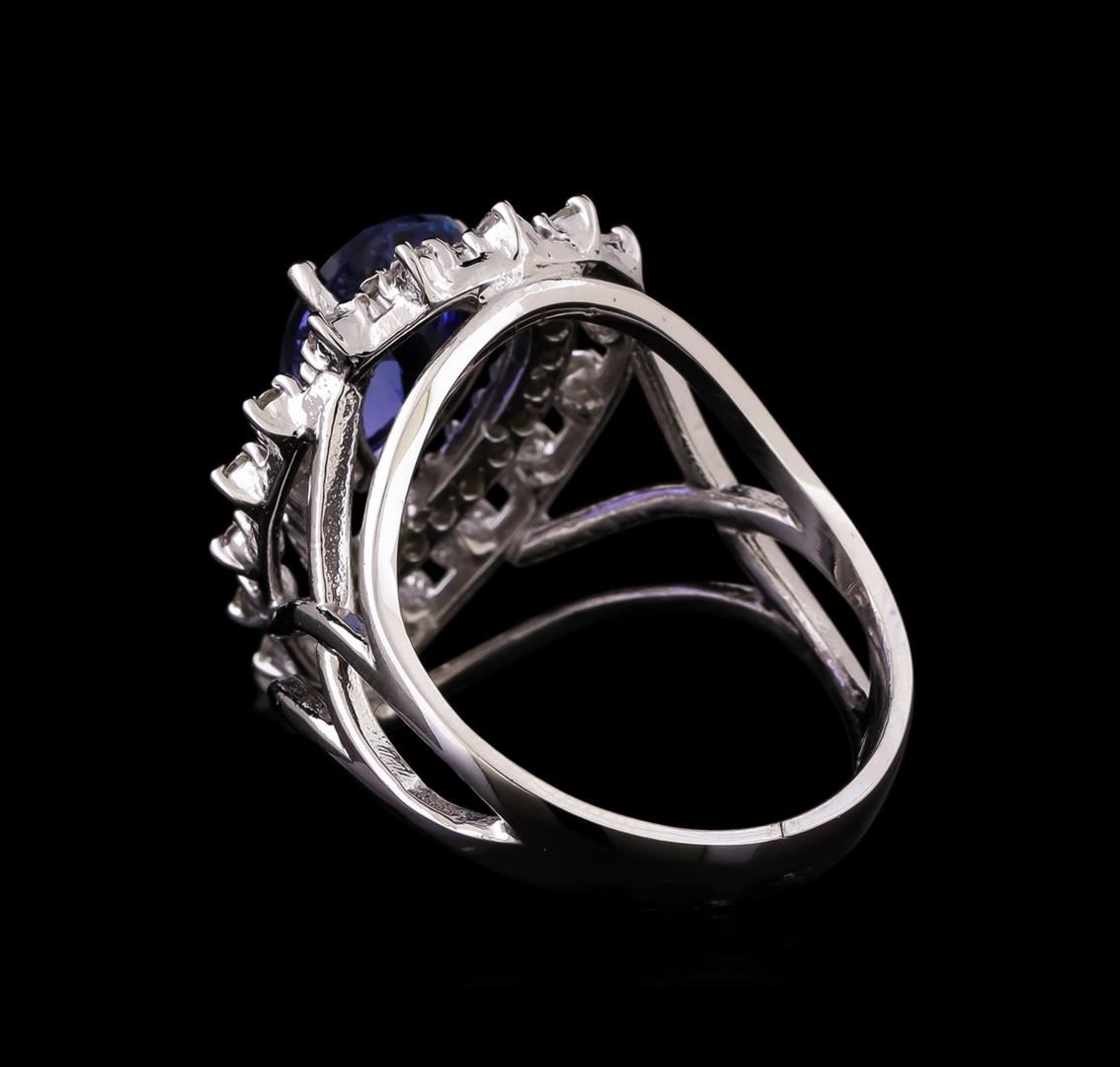 One electronically tested 14KT white gold ladies cast tanzanite and diamond ring with a bright polish finish. Identified with markings of "K14". Condition is new. Containing: One prong set pear modified brilliant cut natural tanzanite, measuring 11.13 x 7.20 x 4.93mm, approximate weight of 2.65ct., clarity is eye clean, type I, medium, very slightly grayish, violet color, (GIA V 5/3), cut is good. Fifty-Four prong set round brilliant cut diamonds, measuring 1.80 - 1.30 x 0.93mm (depth est.) approximate total weight of 54 Stones = 0.73ct. Clarity: SI-2 to I-1. Color: H - I, Cut is Good. Colored gemstones are presumed to have been subjected to commonly used enhancement processes. All diamonds and colored gemstones are graded in the mounting, unless otherwise stated. Total Weight of Colored Stones 2.65ct. Total Weight of Diamonds 0.73ct. Total Weight of Ring 6.70 grams. GGL Appraised at $5,490.00.