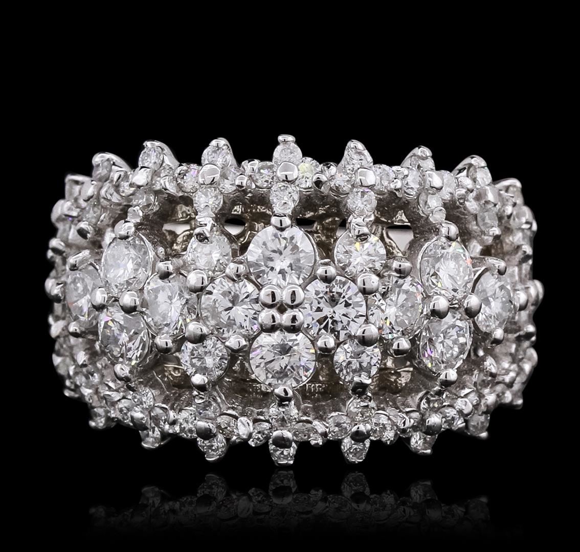 One electronically tested 14KT white gold ladies cast diamond ring with a bright polish finish. The ring features a diamond curvature set within mirroring diamond ribbons supported by split shoulders and an elaborate under gallery, completed by a four millimeter wide band. Identified with markings of "14K". Condition is new, good workmanship. Containing: Twelve prong set round brilliant cut diamonds, measuring 3.30 - 3.20 x 1.95mm (depth est.) approximate total weight of 12 Stones = 1.60 ct. Graded in the setting. Clarity: SI-2 to I-1. Color: G - I Four prong set round brilliant cut diamonds, measuring 2.50 - 2.40 x 1.47mm (depth est.) approximate total weight of 4 Stones = 0.25ct. Graded in the setting. Clarity: SI-2 to I-1. Color: G - I Eighty prong set round brilliant cut diamonds, measuring 1.40 - 1.30 x 0.81mm (depth est.) approximate total weight of 80 Stones = 0.82ct. Graded in the setting. Clarity: SI-1 to I-1. Color: G - I. Total Weight of Diamonds 2.67ct. Total Weight of Ring 10.91 grams. AIG Appraised.