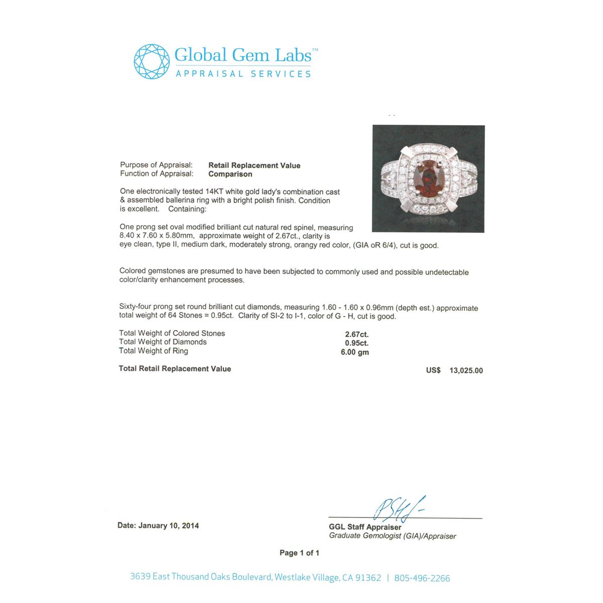 One electronically tested 14KT white gold Ladies combination cast & assembled ballerina ring with a bright polish finish. Condition is excellent. Containing: One prong set oval modified brilliant cut natural red spinel, measuring 8.40 x 7.60 x 5.80mm, approximate weight of 2.67ct., clarity is eye clean, type II, medium dark, moderately strong, orangy red color, (GIA oR 6/4), cut is good. Colored gemstones are presumed to have been subjected to commonly used and possible undetectable color/clarity enhancement processes. Sixty-Four prong set round brilliant cut diamonds, measuring 1.60 - 1.60 x 0.96mm (depth est.) approximate total weight of 64 Stones = 0.95ct. Clarity of SI-2 to I-1, Color of G - H, Cut is Good. Total Weight of Colored Stones 2.67ct. Total Weight of Diamonds 0.95ct. Total Weight of Ring 6.00gm. GGL Appraised at $13,025.00.