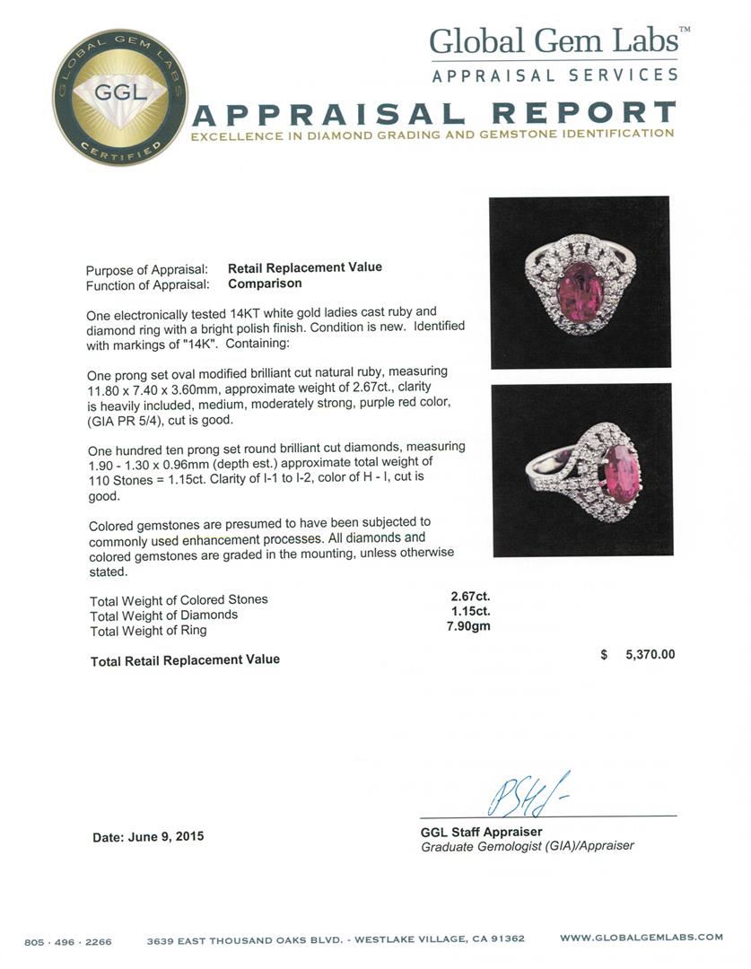 One electronically tested 14KT white gold ladies cast ruby and diamond ring with a bright polish finish. Identified with markings of "14K". Condition is new. Containing: One prong set oval modified brilliant cut natural ruby, measuring 11.80 x 7.40 x 3.60mm, approximate weight of 2.67ct., clarity is heavily included, medium, moderately strong, purple red color, (GIA PR 5/4), cut is good. One Hundred Ten prong set round brilliant cut diamonds, measuring 1.90 - 1.30 x 0.96mm (depth est.) approximate total weight of 110 Stones = 1.15ct. Clarity: I-1 to I-2. Color: H - I, Cut is Good. Colored gemstones are presumed to have been subjected to commonly used enhancement processes. All diamonds and colored gemstones are graded in the mounting, unless otherwise stated. Total Weight of Colored Stones 2.67ct. Total Weight of Diamonds 1.15ct. Total Weight of Ring 7.90 grams. GGL Appraised at $5,370.00.