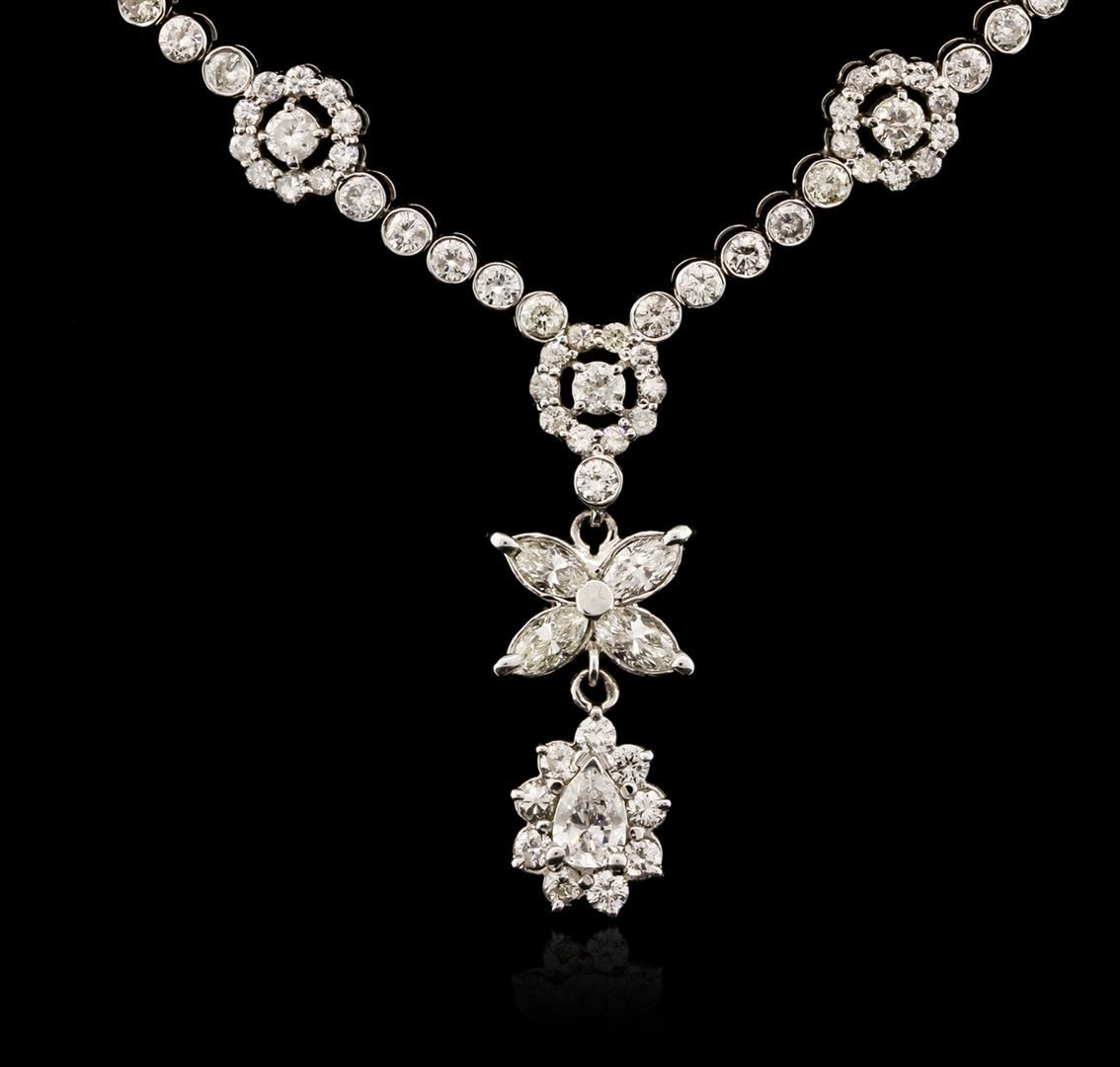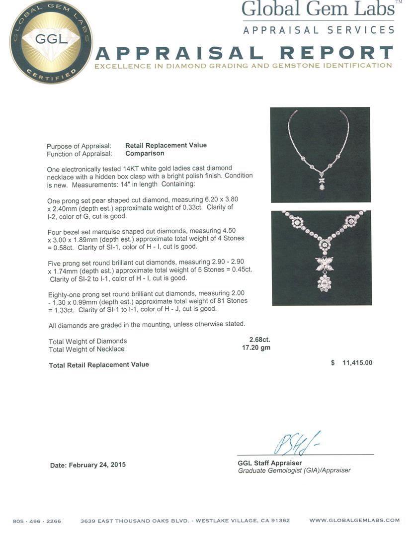 One electronically tested 14KT white gold ladies cast diamond necklace with a hidden box clasp with a bright polish finish. Measurements: 14" in length Condition is new. Containing: One prong set pear shaped cut diamond, measuring 6.20 x 3.80 x 2.40mm (depth est.) approximate weight of 0.33ct. Clarity: I-2. Color: G, Cut is Good. Four bezel set marquise shaped cut diamonds, measuring 4.50 x 3.00 x 1.89mm (depth est.) approximate total weight of 4 Stones = 0.58ct. Clarity: SI-1. Color: H - I, Cut is Good. Five prong set round brilliant cut diamonds, measuring 2.90 - 2.90 x 1.74mm (depth est.) approximate total weight of 5 Stones = 0.45ct. Clarity: SI-2 to I-1. Color: H - I, Cut is Good. Eighty-One prong set round brilliant cut diamonds, measuring 2.00 - 1.30 x 0.99mm (depth est.) approximate total weight of 81 Stones = 1.33ct. Clarity: SI-1 to I-1. Color: H - J, Cut is Good. All diamonds are graded in the mounting, unless otherwise stated. Total Weight of Diamonds 2.68ct. Total Weight of Necklace 17.20 grams. GGL Appraised at $11,415.00.