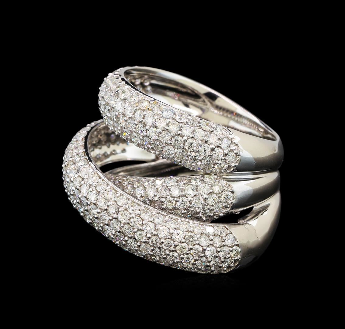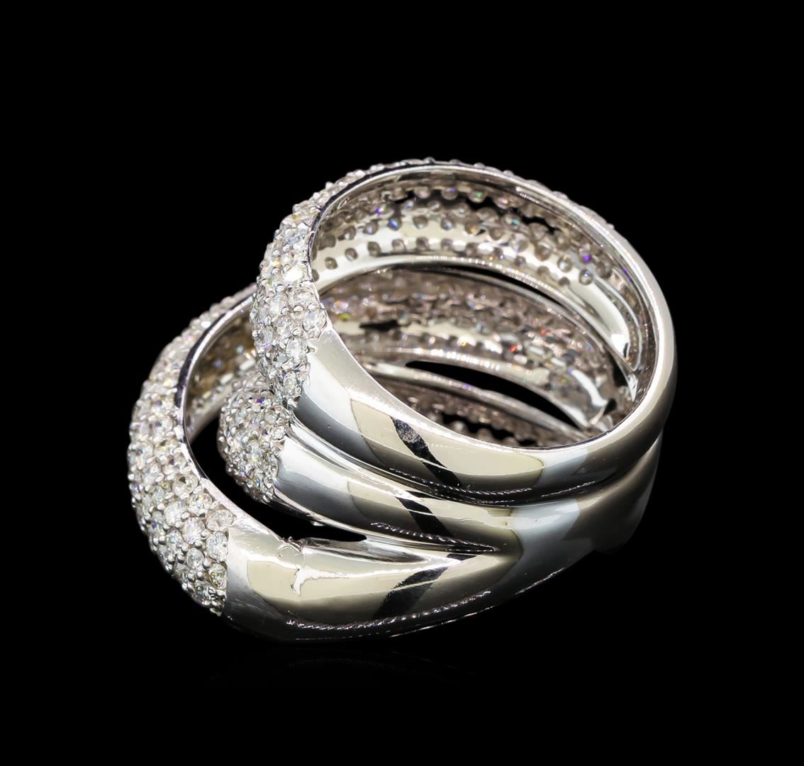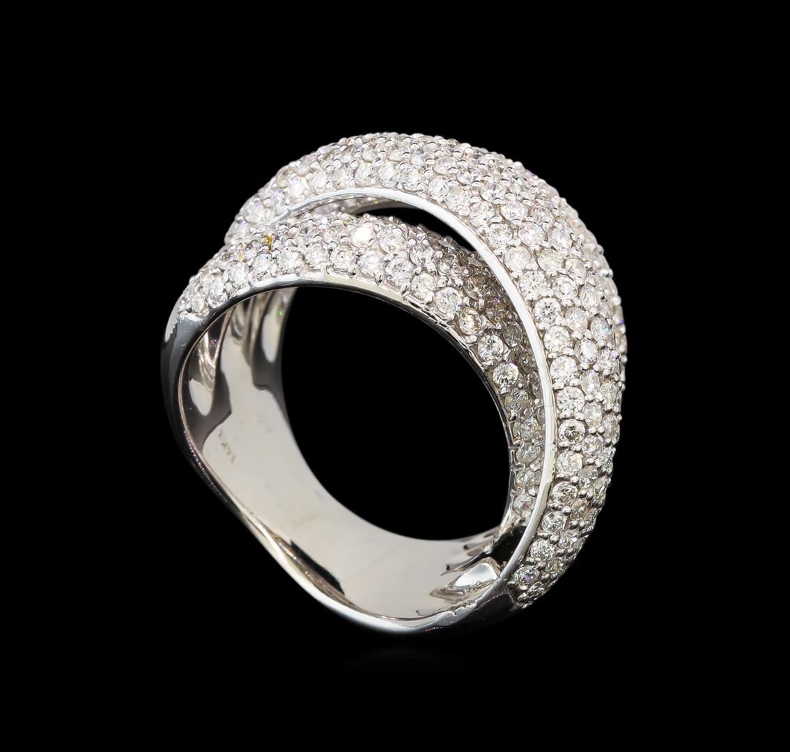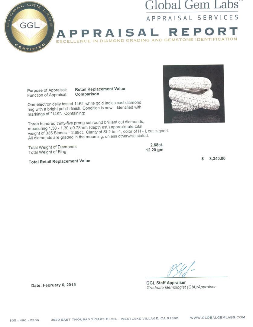 One electronically tested 14KT white gold ladies cast diamond ring with a bright polish finish. Identified with markings of "14K". Condition is new. Containing: Three Hundred Thirty-Five prong set round brilliant cut diamonds, measuring 1.30 - 1.30 x 0.78mm (depth est.) approximate total weight of 335 Stones = 2.68ct. Clarity: SI-2 to I-1. Color: H - I, Cut is Good. All diamonds are graded in the mounting, unless otherwise stated. Total Weight of Diamonds 2.68ct. Total Weight of Ring 12.20 grams. GGL Appraised.