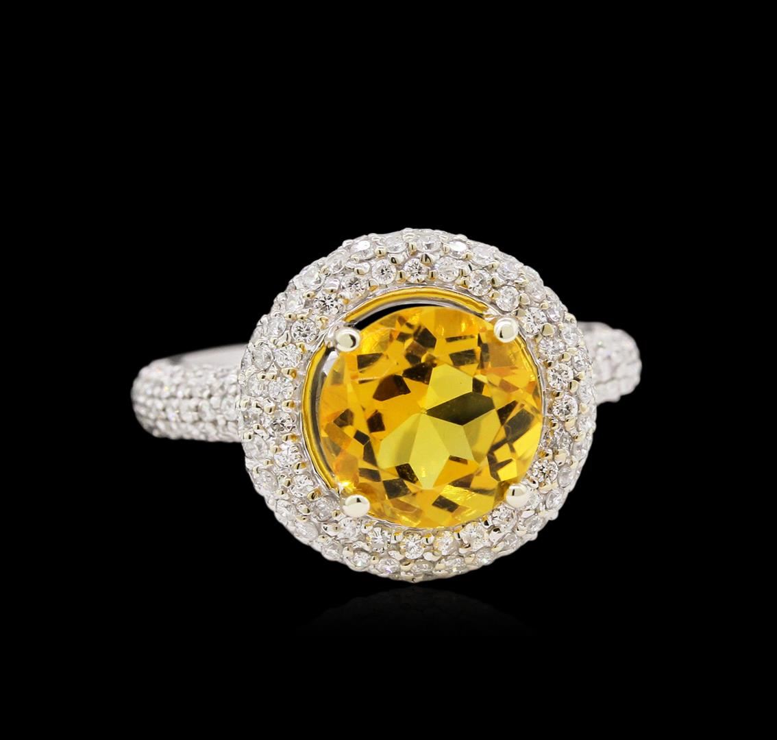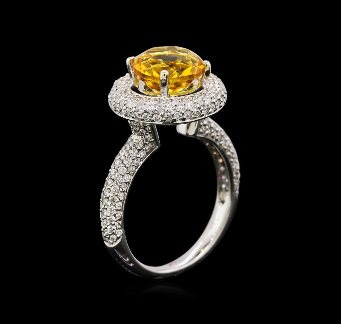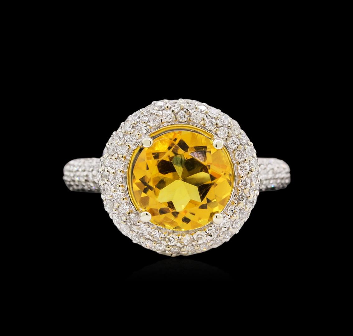 One electronically tested 14KT white gold Ladies combination cast & assembled ring with a bright polish finish. Condition is new. Identified with markings of "14K". Containing: One prong set round modified brilliant cut natural citrine quartz, measuring 9.10 - 9.10 x 6.10 mm, exact weight 2.70ct., clarity is eye clean, type I, medium light, moderately strong, orangy yellow color, (GIA oY 4/4), cut is very good. Colored gemstones are presumed to have been subjected to commonly used color/clarity enhancement processes. One Hundred Seventy-One bead set round brilliant cut diamonds, measuring 1.00 - 1.00 x 0.60mm (depth est.) approximate. Total Weight of 171 Stones = 1.29ct. Clarity: I-2 to I-3. Color: I - J, Cut is Good. Total Weight of Colored Stones 2.70ct. Total Weight of Diamonds 1.29ct. Total Weight of Ring 5.80 grams. GGL Appraised at $4,935.00.