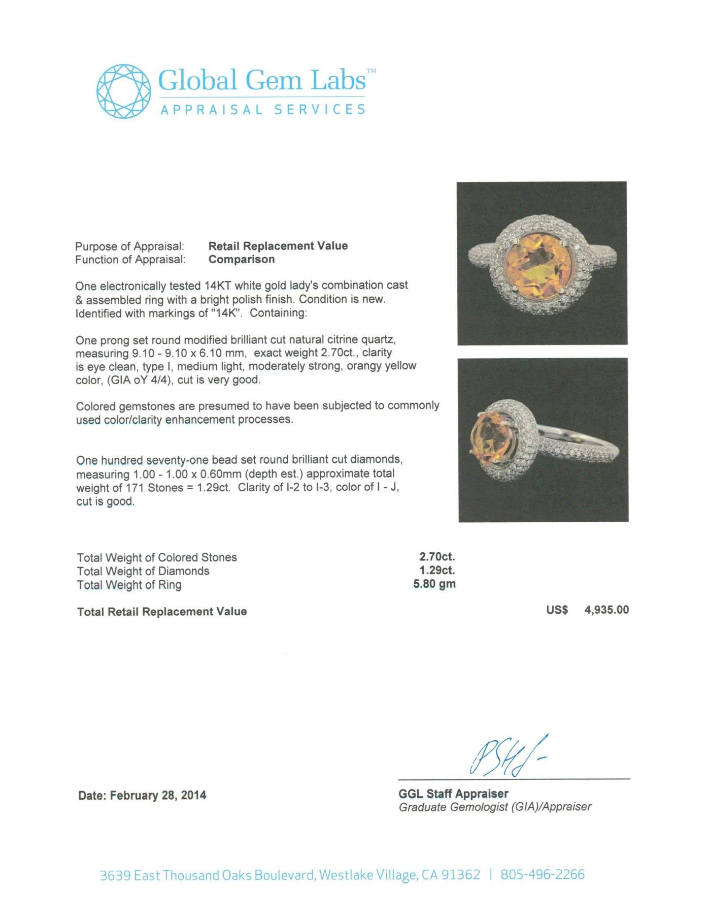One electronically tested 14KT white gold Ladies combination cast & assembled ring with a bright polish finish. Condition is new. Identified with markings of "14K". Containing: One prong set round modified brilliant cut natural citrine quartz, measuring 9.10 - 9.10 x 6.10 mm, exact weight 2.70 ct., clarity is eye clean, type I, medium light, moderately strong, orangy yellow color, (GIA oY 4/4), cut is very good. Colored gemstones are presumed to have been subjected to commonly used color/clarity enhancement processes. One Hundred Seventy-One bead set round brilliant cut diamonds, measuring 1.00 - 1.00 x 0.60mm (depth est.) approximate. Total Weight of 171 Stones = 1.29ct. Clarity: I-2 to I-3. Color: I - J, Cut is Good. Total Weight of Colored Stones 2.70 ct. Total Weight of Diamonds 1.29ct. Total Weight of Ring 5.80 grams. GGL Appraised.