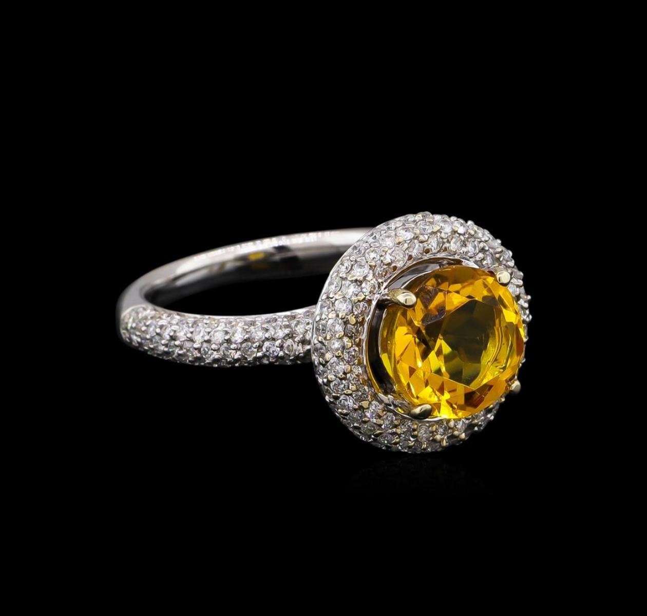 One electronically tested 14KT white gold Ladies combination cast & assembled ring with a bright polish finish. Condition is new. Identified with markings of "14K". Containing: One prong set round modified brilliant cut natural citrine quartz, measuring 9.10 - 9.10 x 6.10 mm, exact weight 2.70 ct., clarity is eye clean, type I, medium light, moderately strong, orangy yellow color, (GIA oY 4/4), cut is very good. Colored gemstones are presumed to have been subjected to commonly used color/clarity enhancement processes. One Hundred Seventy-One bead set round brilliant cut diamonds, measuring 1.00 - 1.00 x 0.60mm (depth est.) approximate. Total Weight of 171 Stones = 1.29ct. Clarity: I-2 to I-3. Color: I - J, Cut is Good. Total Weight of Colored Stones 2.70 ct. Total Weight of Diamonds 1.29ct. Total Weight of Ring 5.80 grams. GGL Appraised.