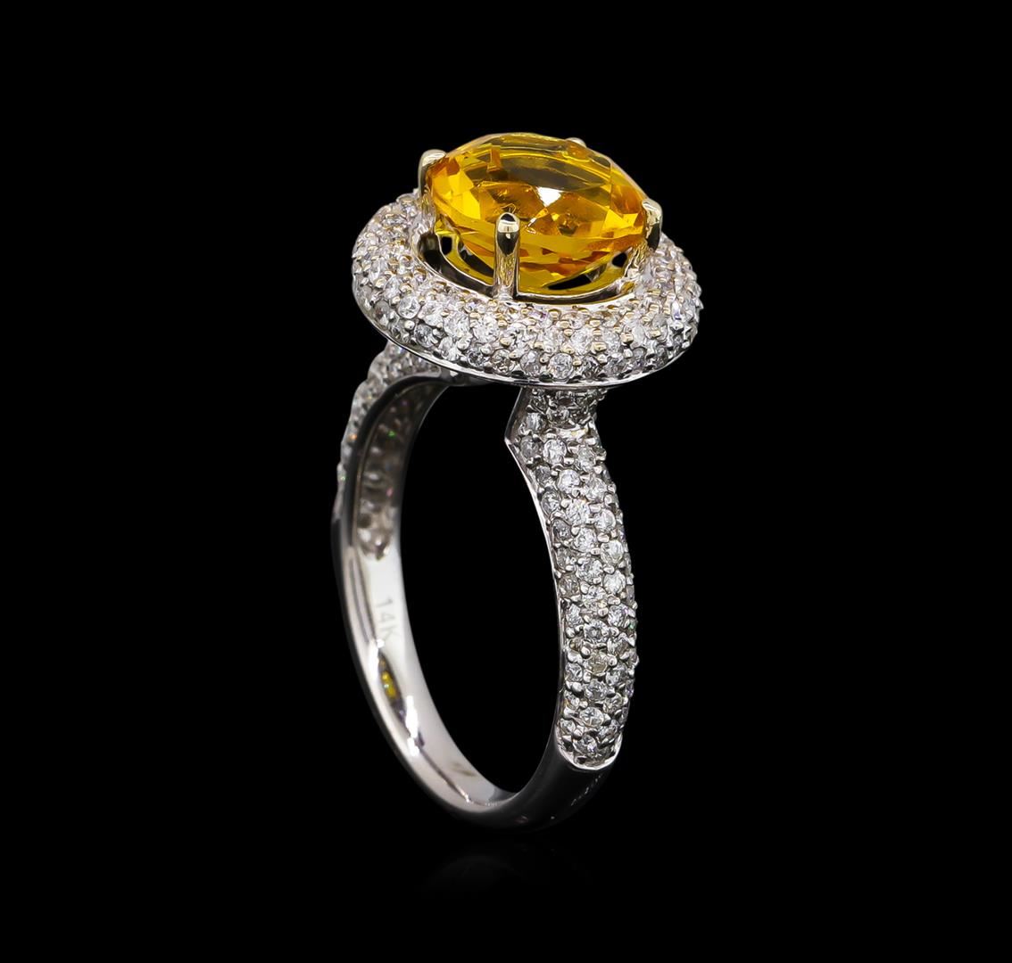 One electronically tested 14KT white gold Ladies combination cast & assembled ring with a bright polish finish. Condition is new. Identified with markings of "14K". Containing: One prong set round modified brilliant cut natural citrine quartz, measuring 9.10 - 9.10 x 6.10 mm, exact weight 2.70 ct., clarity is eye clean, type I, medium light, moderately strong, orangy yellow color, (GIA oY 4/4), cut is very good. Colored gemstones are presumed to have been subjected to commonly used color/clarity enhancement processes. One Hundred Seventy-One bead set round brilliant cut diamonds, measuring 1.00 - 1.00 x 0.60mm (depth est.) approximate. Total Weight of 171 Stones = 1.29ct. Clarity: I-2 to I-3. Color: I - J, Cut is Good. Total Weight of Colored Stones 2.70 ct. Total Weight of Diamonds 1.29ct. Total Weight of Ring 5.80 grams. GGL Appraised.