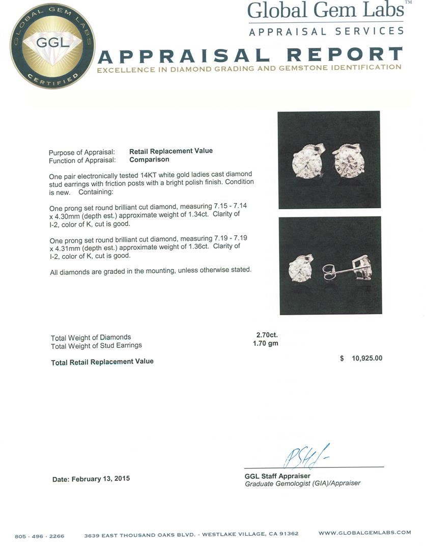 One pair electronically tested 14KT white gold ladies cast diamond stud earrings with friction posts with a bright polish finish. Condition is new. Containing: One prong set round brilliant cut diamond, measuring 7.15 - 7.14 x 4.30mm (depth est.) approximate weight of 1.34ct. Clarity: I-2. Color: K, Cut is Good. One prong set round brilliant cut diamond, measuring 7.19 - 7.19 x 4.31mm (depth est.) approximate weight of 1.36ct. Clarity: I-2. Color: K, Cut is Good. All diamonds are graded in the mounting, unless otherwise stated. Total Weight of Diamonds 2.70ct. Total Weight of Stud Earrings 1.70 grams. GGL Appraised at $10,925.00.