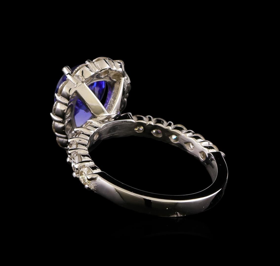 One electronically tested 14KT white gold ladies combination cast & assembled sapphire and diamond ring with a bright polish finish. Identified with markings of "14K". Condition is new. Containing: One prong set pear modified brilliant cut natural tanzanite, measuring 10.59 x 7.65 x 4.97mm, approximate weight of 2.70ct., clarity is eye clean, type I, medium, moderately strong, violet color, (GIA V 5/4), cut is good. Twenty-Two prong set round brilliant cut diamonds, measuring 2.50 - 2.50 x 1.50mm (depth est.) approximate total weight of 22 Stones = 1.26ct. Clarity: SI-2 to I-1. Color: J, Cut is Good. Colored gemstones are presumed to have been subjected to commonly used enhancement processes. All diamonds and colored gemstones are graded in the mounting, unless otherwise stated. Total Weight of Colored Stones 2.70ct. Total Weight of Diamonds 1.26ct. Total Weight of Ring 4.70 grams. GGL Appraised at $6,010.00.