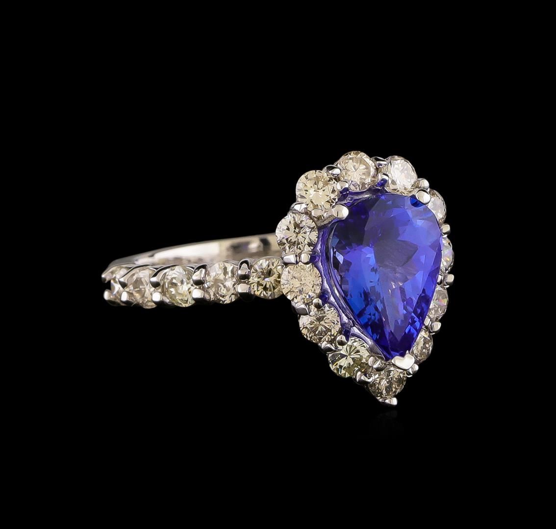 One electronically tested 14KT white gold ladies combination cast & assembled sapphire and diamond ring with a bright polish finish. Identified with markings of "14K". Condition is new. Containing: One prong set pear modified brilliant cut natural tanzanite, measuring 10.59 x 7.65 x 4.97mm, approximate weight of 2.70ct., clarity is eye clean, type I, medium, moderately strong, violet color, (GIA V 5/4), cut is good. Twenty-Two prong set round brilliant cut diamonds, measuring 2.50 - 2.50 x 1.50mm (depth est.) approximate total weight of 22 Stones = 1.26ct. Clarity: SI-2 to I-1. Color: J, Cut is Good. Colored gemstones are presumed to have been subjected to commonly used enhancement processes. All diamonds and colored gemstones are graded in the mounting, unless otherwise stated. Total Weight of Colored Stones 2.70ct. Total Weight of Diamonds 1.26ct. Total Weight of Ring 4.70 grams. GGL Appraised at $6,010.00.