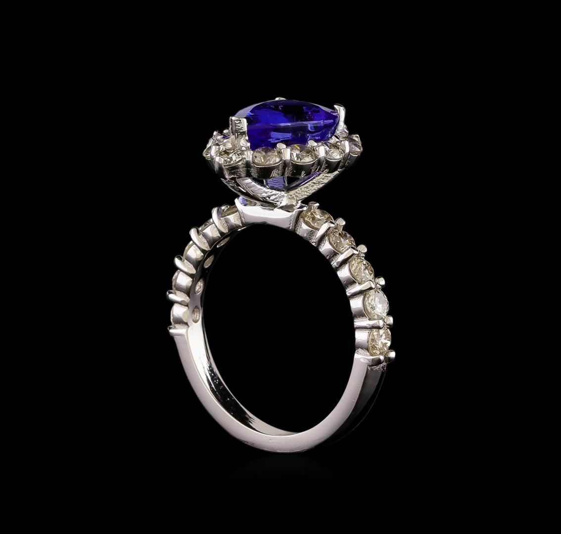One electronically tested 14KT white gold ladies combination cast & assembled sapphire and diamond ring with a bright polish finish. Identified with markings of "14K". Condition is new. Containing: One prong set pear modified brilliant cut natural tanzanite, measuring 10.59 x 7.65 x 4.97mm, approximate weight of 2.70ct., clarity is eye clean, type I, medium, moderately strong, violet color, (GIA V 5/4), cut is good. Twenty-Two prong set round brilliant cut diamonds, measuring 2.50 - 2.50 x 1.50mm (depth est.) approximate total weight of 22 Stones = 1.26ct. Clarity: SI-2 to I-1. Color: J, Cut is Good. Colored gemstones are presumed to have been subjected to commonly used enhancement processes. All diamonds and colored gemstones are graded in the mounting, unless otherwise stated. Total Weight of Colored Stones 2.70ct. Total Weight of Diamonds 1.26ct. Total Weight of Ring 4.70 grams. GGL Appraised at $6,010.00.