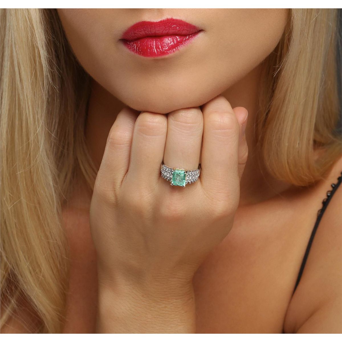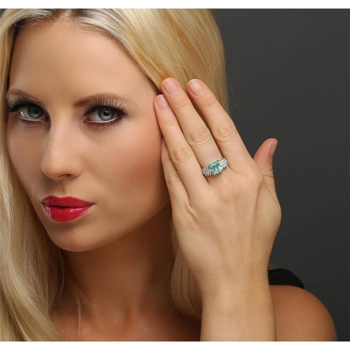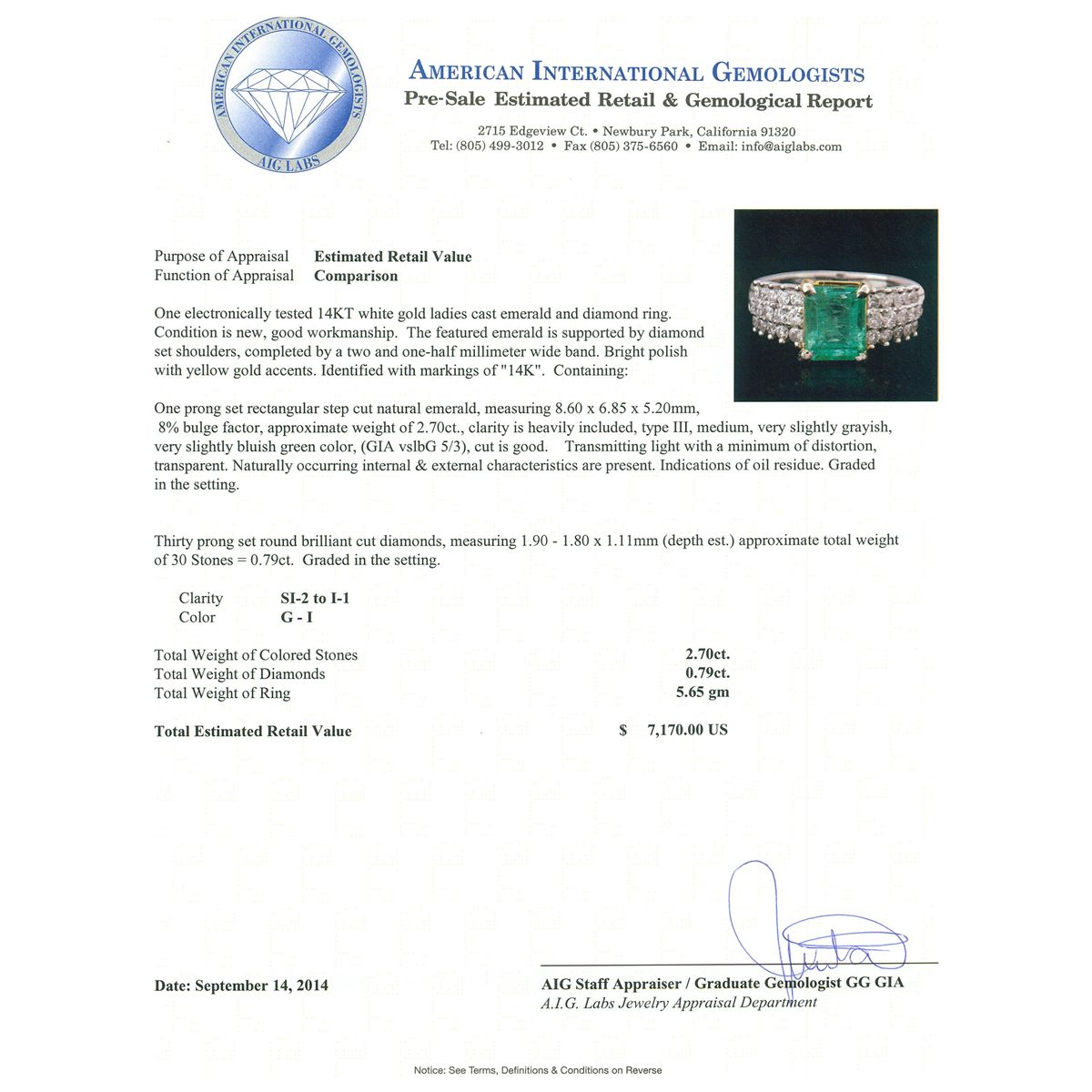 One electronically tested 14KT white gold ladies cast emerald and diamond ring. The featured emerald is supported by diamond set shoulders, completed by a two and one-half millimeter wide band. Bright polish with yellow gold accents. Identified with markings of "14K". Condition is new, good workmanship. Containing: One prong set rectangular step cut natural emerald, measuring 8.60 x 6.85 x 5.20mm, 8% bulge factor, approximate weight of 2.70ct., clarity is heavily included, type III, medium, very slightly grayish, very slightly bluish green color, (GIA vslbG 5/3), cut is good. Transmitting light with a minimum of distortion, transparent. Naturally occurring internal & external characteristics are present. Indications of oil residue. Graded in the setting. Thirty prong set round brilliant cut diamonds, measuring 1.90 - 1.80 x 1.11mm (depth est.) approximate total weight of 30 Stones = 0.79ct. Graded in the setting. Clarity: SI-2 to I-1. Color: G - I. Total Weight of Colored Stones 2.70ct. Total Weight of Diamonds 0.79ct. Total Weight of Ring 5.65 grams. AIG Appraised at $7,170.00.