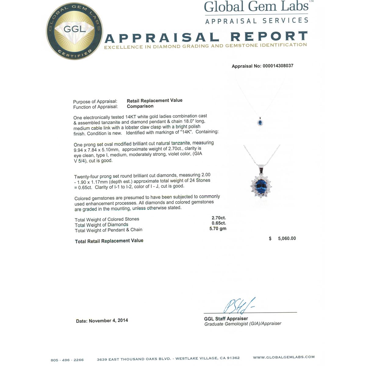 One electronically tested 14KT white gold ladies combination cast & assembled tanzanite and diamond pendant & chain 18.0" long, medium cable link with a lobster claw clasp with a bright polish finish. Identified with markings of "14K". Condition is new. Containing: One prong set oval modified brilliant cut natural tanzanite, measuring 9.94 x 7.84 x 5.10mm, approximate weight of 2.70ct., clarity is eye clean, type I, medium, moderately strong, violet color, (GIA V 5/4), cut is good. Twenty-Four prong set round brilliant cut diamonds, measuring 2.00 - 1.90 x 1.17mm (depth est.) approximate total weight of 24 Stones = 0.65ct. Clarity: I-1 to I-2. Color: I - J, Cut is Good. Colored gemstones are presumed to have been subjected to commonly used enhancement processes. All diamonds and colored gemstones are graded in the mounting, unless otherwise stated. Total Weight of Colored Stones 2.70ct. Total Weight of Diamonds 0.65ct. Total Weight of Pendant & Chain 5.70 grams. GGL Appraised at $5,060.00.