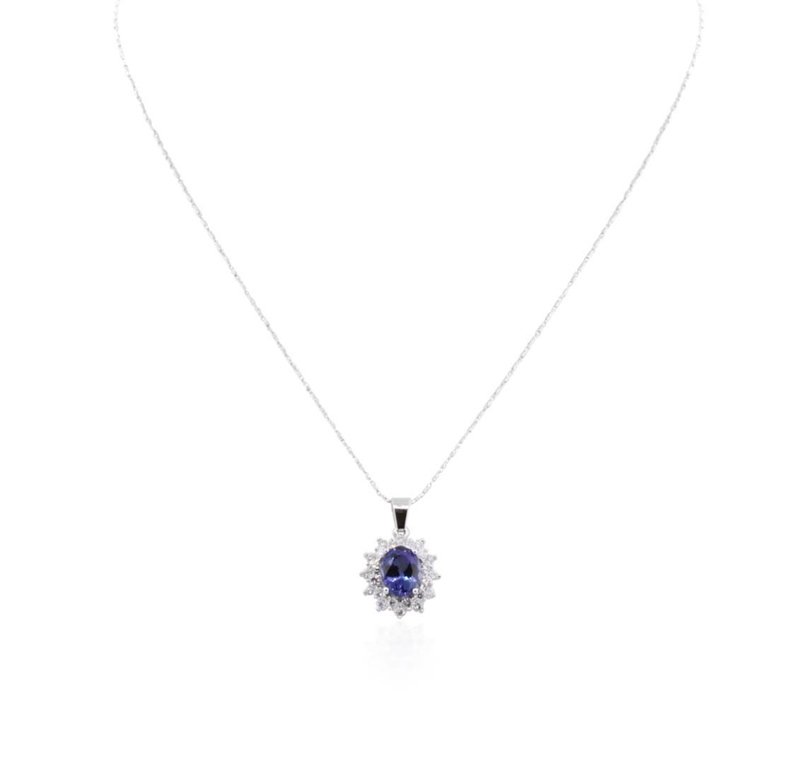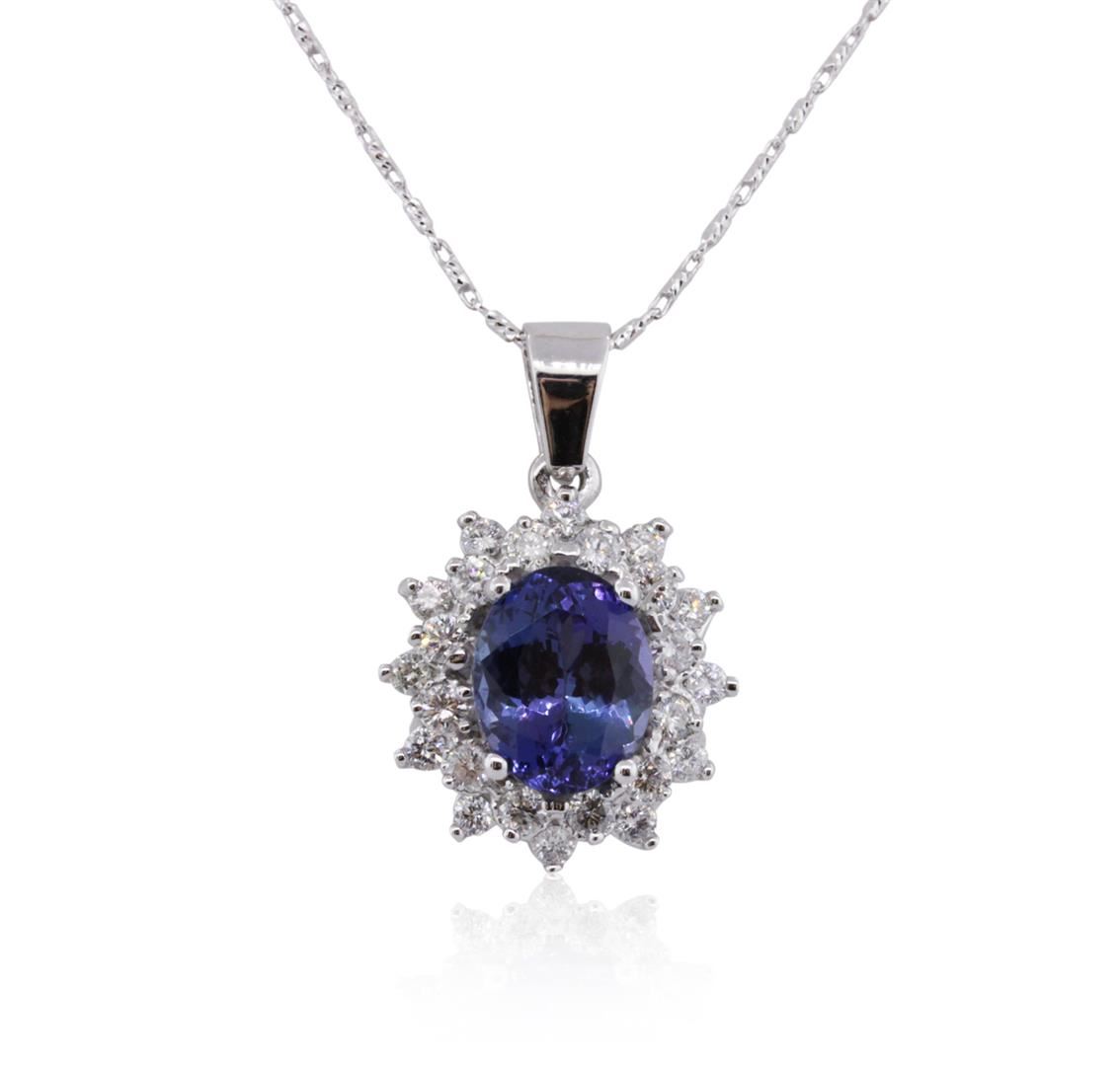One electronically tested 14KT white gold ladies combination cast & assembled tanzanite and diamond pendant & chain 18.0" long, medium cable link with a lobster claw clasp with a bright polish finish. Identified with markings of "14K". Condition is new. Containing: One prong set oval modified brilliant cut natural tanzanite, measuring 9.94 x 7.84 x 5.10mm, approximate weight of 2.70ct., clarity is eye clean, type I, medium, moderately strong, violet color, (GIA V 5/4), cut is good. Twenty-Four prong set round brilliant cut diamonds, measuring 2.00 - 1.90 x 1.17mm (depth est.) approximate total weight of 24 Stones = 0.65ct. Clarity: I-1 to I-2. Color: I - J, Cut is Good. Colored gemstones are presumed to have been subjected to commonly used enhancement processes. All diamonds and colored gemstones are graded in the mounting, unless otherwise stated. Total Weight of Colored Stones 2.70ct. Total Weight of Diamonds 0.65ct. Total Weight of Pendant & Chain 5.70 grams. GGL Appraised at $5,060.00.