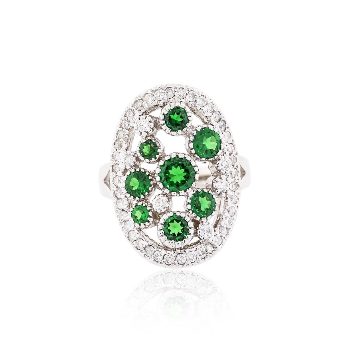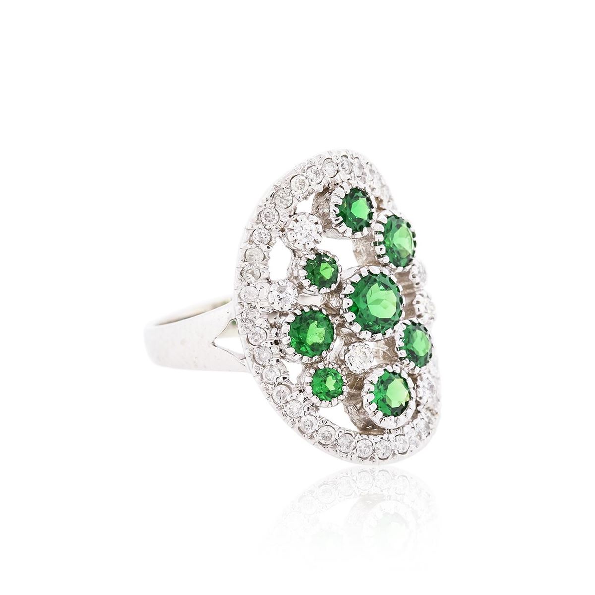 One electronically tested 14KT white gold ladies cast tsavorite and diamond ring with a bright finish. The ring features a series of round tsavorites, set within a diamond bezel, supported by tapering shoulders, completed by a three millimeter wide band. Identified with markings of "K14". Condition is good. Containing: Eight bezel set round mixed cut natural tsavorite garnets, measuring 4.70 - 2.60 x 2.03 mm, approximate total weight of 2.70ct., clarity is eye clean, type II, medium dark, strong, green color, (GIA G 6/5), cut is good. Transmitting light with no distortion, transparent. Graded in the setting. Forty-Six prong set round brilliant cut diamonds, measuring 1.80 - 1.30 x 0.95mm (depth est.) approximate total weight of 46 Stones = 0.64ct. Graded in the setting. Clarity I-1 to I-2. Color G - H. Total Weight of Colored Stones 2.70ct. Total Weight of Diamonds 0.64ct. Total Weight of Ring 8.58 grams. AIG Appraised at $6,880.00.