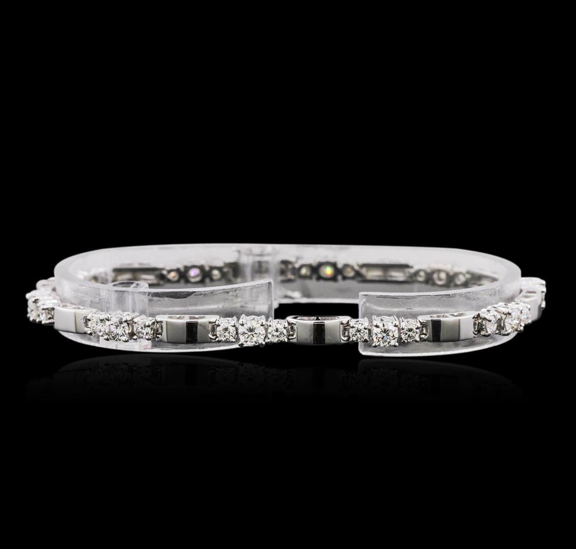 One electronically tested 14KT white gold ladies cast diamond bracelet with a hidden box clasp with safety closer with a bright polish finish. Measurements: 7 " in length Identified with markings of "14K". Condition is new. Containing: Ten prong set round brilliant cut diamonds, measuring 3.50 - 3.50 x 2.10mm (depth est.) approximate total weight of 10 Stones = 1.57ct. Clarity: SI-1 to I-1. Color: I - J, Cut is Good. Twenty prong set round brilliant cut diamonds, measuring 2.50 - 2.50 x 1.50mm (depth est.) approximate total weight of 20 Stones = 1.14ct. Clarity: SI-1 to I-1. Color: I - J, Cut is Good. All diamonds are graded in the mounting, unless otherwise stated. Total Weight of Diamonds 2.71ct. Total Weight of Bracelet 15.20 grams. GGL Appraised at $8,280.00.