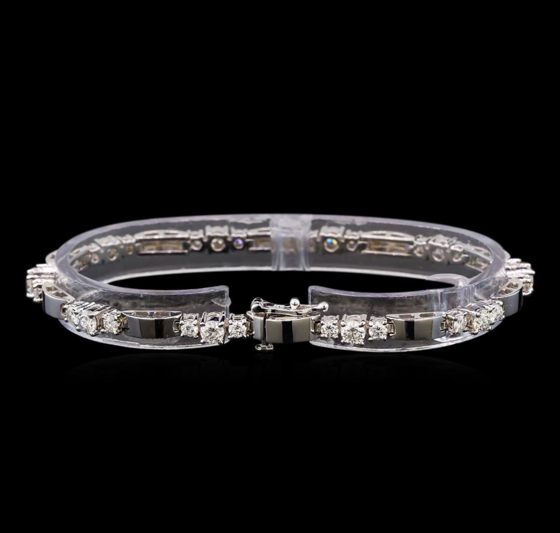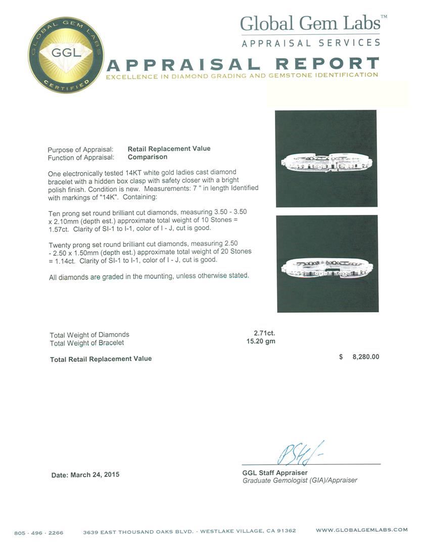 One electronically tested 14KT white gold ladies cast diamond bracelet with a hidden box clasp with safety closer with a bright polish finish. Measurements: 7 " in length Identified with markings of "14K". Condition is new. Containing: Ten prong set round brilliant cut diamonds, measuring 3.50 - 3.50 x 2.10mm (depth est.) approximate total weight of 10 Stones = 1.57ct. Clarity: SI-1 to I-1. Color: I - J, Cut is Good. Twenty prong set round brilliant cut diamonds, measuring 2.50 - 2.50 x 1.50mm (depth est.) approximate total weight of 20 Stones = 1.14ct. Clarity: SI-1 to I-1. Color: I - J, Cut is Good. All diamonds are graded in the mounting, unless otherwise stated. Total Weight of Diamonds 2.71ct. Total Weight of Bracelet 15.20 grams. GGL Appraised at $8,280.00.