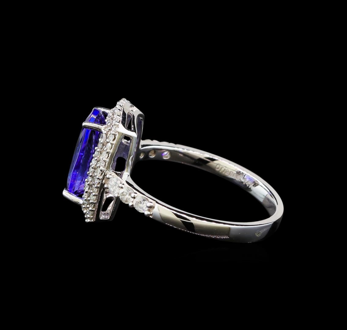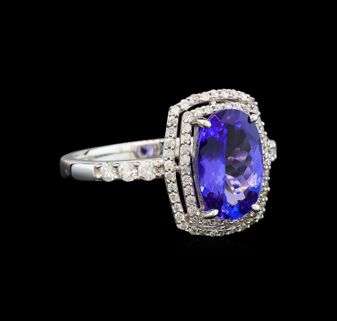 One electronically tested 14KT white gold ladies cast tanzanite and diamond ring with a bright polish finish. Identified with markings of "14K". Condition is new. Containing: One prong set rectangular cushion modified brilliant cut natural tanzanite, measuring 10.45 x 6.89 x 4.78mm, approximate weight of 2.71ct., clarity is eye clean, type I, medium light, very slightly grayish, violet color, (GIA V 4/3), cut is good. Seventy-Four prong set round brilliant cut diamonds, measuring 1.00 - 1.00 x 0.60mm (depth est.) approximate total weight of 74 Stones = 0.27ct. Clarity: I-1 to I-2. Color: I - J. Colored gemstones are presumed to have been subjected to commonly used enhancement processes. All diamonds and colored gemstones are graded in the mounting, unless otherwise stated. Total Weight of Colored Stones 2.71ct. Total Weight of Diamonds 0.27ct. Total Weight of Ring 3.30 grams. GGL Appraised at $3,085.00.