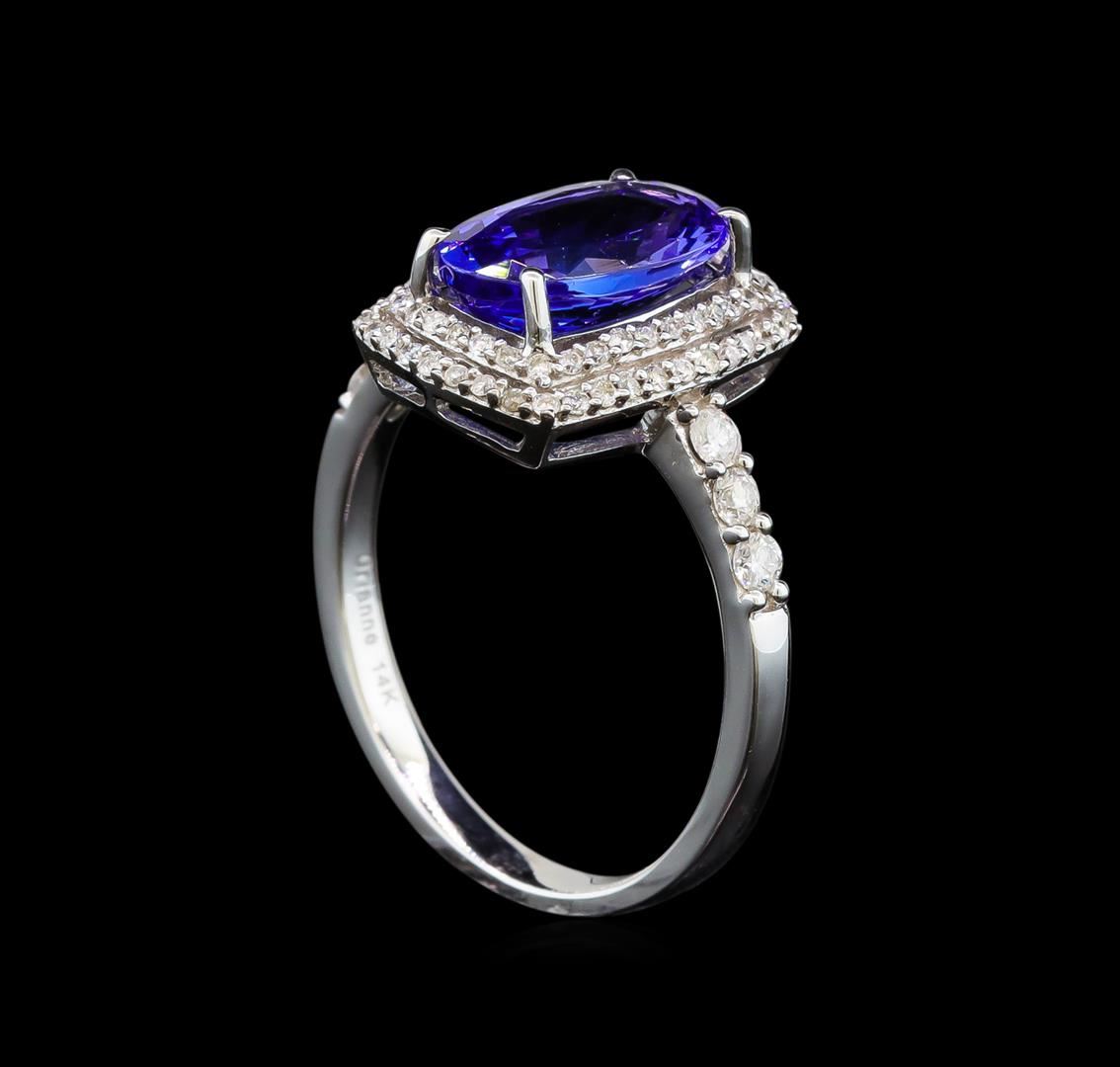 One electronically tested 14KT white gold ladies cast tanzanite and diamond ring with a bright polish finish. Identified with markings of "14K". Condition is new. Containing: One prong set rectangular cushion modified brilliant cut natural tanzanite, measuring 10.45 x 6.89 x 4.78mm, approximate weight of 2.71ct., clarity is eye clean, type I, medium light, very slightly grayish, violet color, (GIA V 4/3), cut is good. Seventy-Four prong set round brilliant cut diamonds, measuring 1.00 - 1.00 x 0.60mm (depth est.) approximate total weight of 74 Stones = 0.27ct. Clarity: I-1 to I-2. Color: I - J. Colored gemstones are presumed to have been subjected to commonly used enhancement processes. All diamonds and colored gemstones are graded in the mounting, unless otherwise stated. Total Weight of Colored Stones 2.71ct. Total Weight of Diamonds 0.27ct. Total Weight of Ring 3.30 grams. GGL Appraised at $3,085.00.