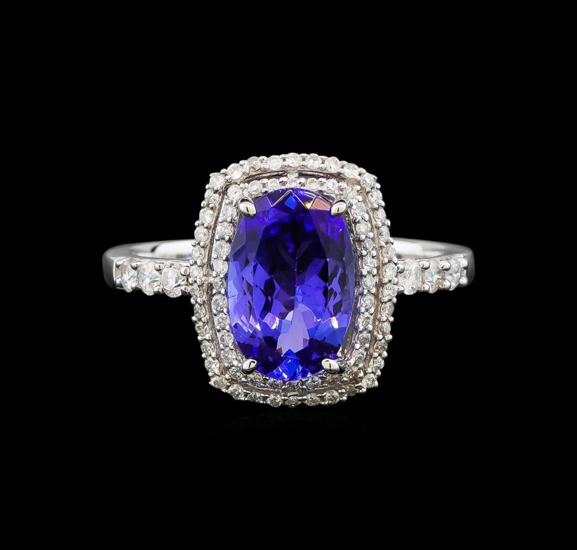 One electronically tested 14KT white gold ladies cast tanzanite and diamond ring with a bright polish finish. Identified with markings of "14K". Condition is new. Containing: One prong set rectangular cushion modified brilliant cut natural tanzanite, measuring 10.45 x 6.89 x 4.78mm, approximate weight of 2.71ct., clarity is eye clean, type I, medium light, very slightly grayish, violet color, (GIA V 4/3), cut is good. Seventy-Four prong set round brilliant cut diamonds, measuring 1.00 - 1.00 x 0.60mm (depth est.) approximate total weight of 74 Stones = 0.27ct. Clarity: I-1 to I-2. Color: I - J. Colored gemstones are presumed to have been subjected to commonly used enhancement processes. All diamonds and colored gemstones are graded in the mounting, unless otherwise stated. Total Weight of Colored Stones 2.71ct. Total Weight of Diamonds 0.27ct. Total Weight of Ring 3.30 grams. GGL Appraised at $3,085.00.