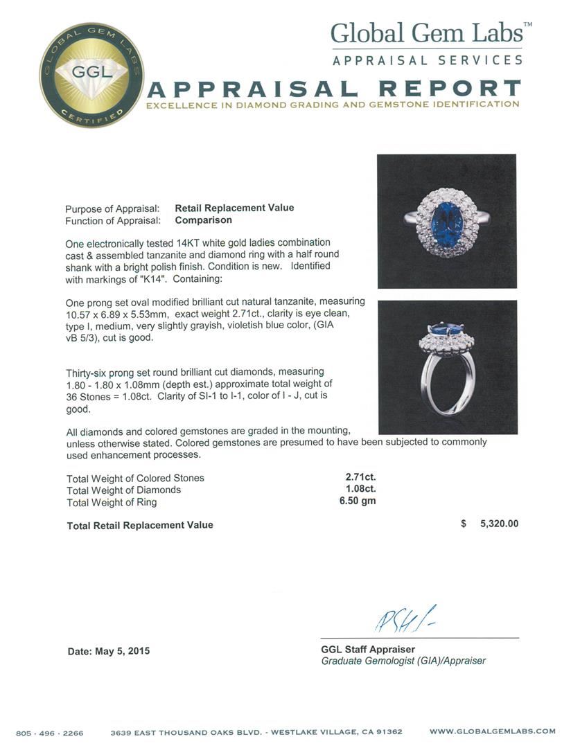One electronically tested 14KT white gold ladies combination cast & assembled tanzanite and diamond ring with a half round shank with a bright polish finish. Identified with markings of "K14". Condition is new. Containing: One prong set oval modified brilliant cut natural tanzanite, measuring 10.57 x 6.89 x 5.53mm, exact weight 2.71ct., clarity is eye clean, type I, medium, very slightly grayish, violetish blue color, (GIA vB 5/3), cut is good. Thirty-Six prong set round brilliant cut diamonds, measuring 1.80 - 1.80 x 1.08mm (depth est.) approximate total weight of 36 Stones = 1.08ct. Clarity: SI-1 to I-1. Color: I - J, Cut is Good. All diamonds and colored gemstones are graded in the mounting, unless otherwise stated. Colored gemstones are presumed to have been subjected to commonly used enhancement processes.. Total Weight of Colored Stones 2.71ct. Total Weight of Diamonds 1.08ct. Total Weight of Ring 6.50 grams.