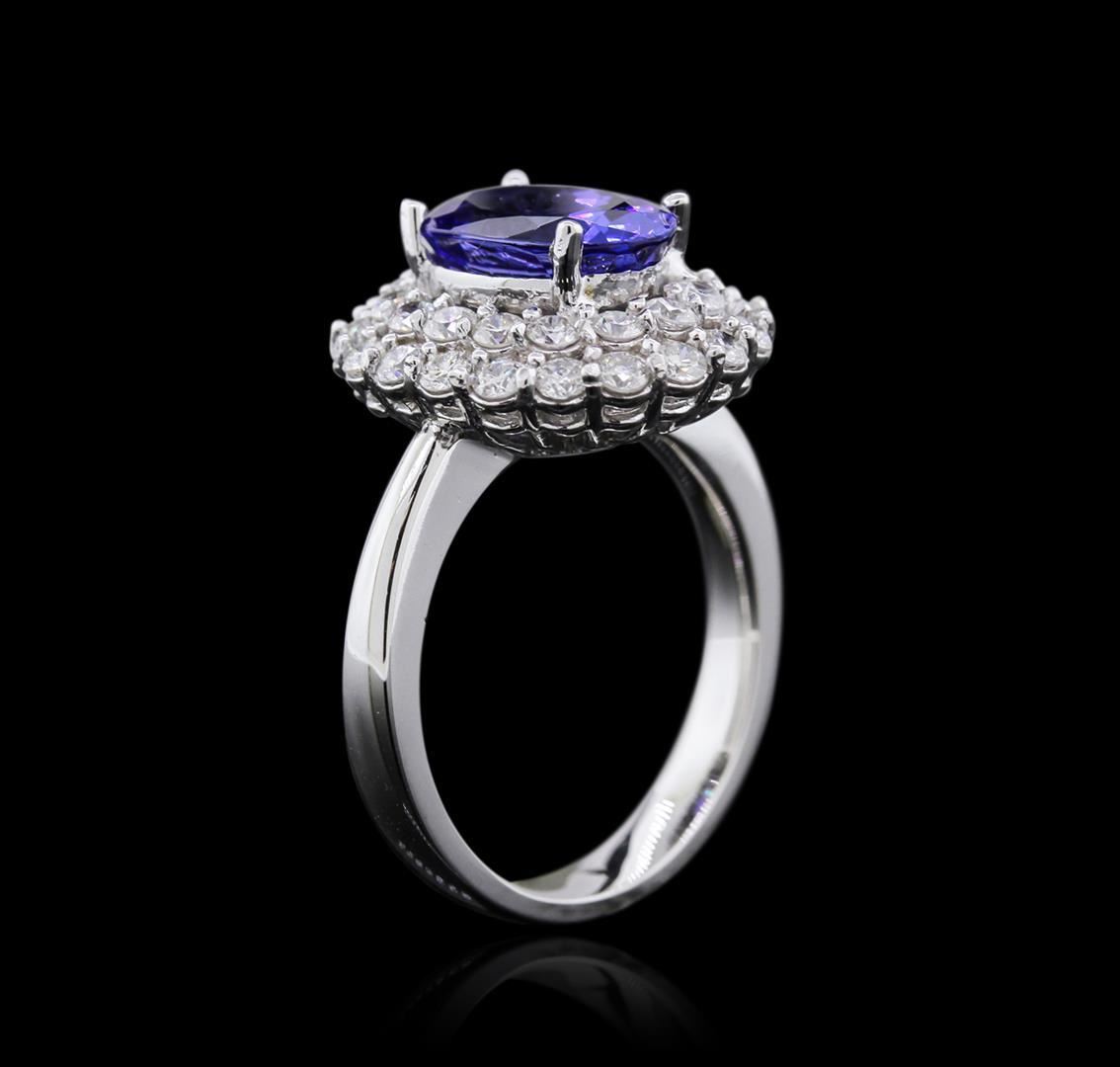 One electronically tested 14KT white gold ladies combination cast & assembled tanzanite and diamond ring with a half round shank with a bright polish finish. Identified with markings of "K14". Condition is new. Containing: One prong set oval modified brilliant cut natural tanzanite, measuring 10.57 x 6.89 x 5.53mm, exact weight 2.71ct., clarity is eye clean, type I, medium, very slightly grayish, violetish blue color, (GIA vB 5/3), cut is good. Thirty-Six prong set round brilliant cut diamonds, measuring 1.80 - 1.80 x 1.08mm (depth est.) approximate total weight of 36 Stones = 1.08ct. Clarity: SI-1 to I-1. Color: I - J, Cut is Good. All diamonds and colored gemstones are graded in the mounting, unless otherwise stated. Colored gemstones are presumed to have been subjected to commonly used enhancement processes.. Total Weight of Colored Stones 2.71ct. Total Weight of Diamonds 1.08ct. Total Weight of Ring 6.50 grams.