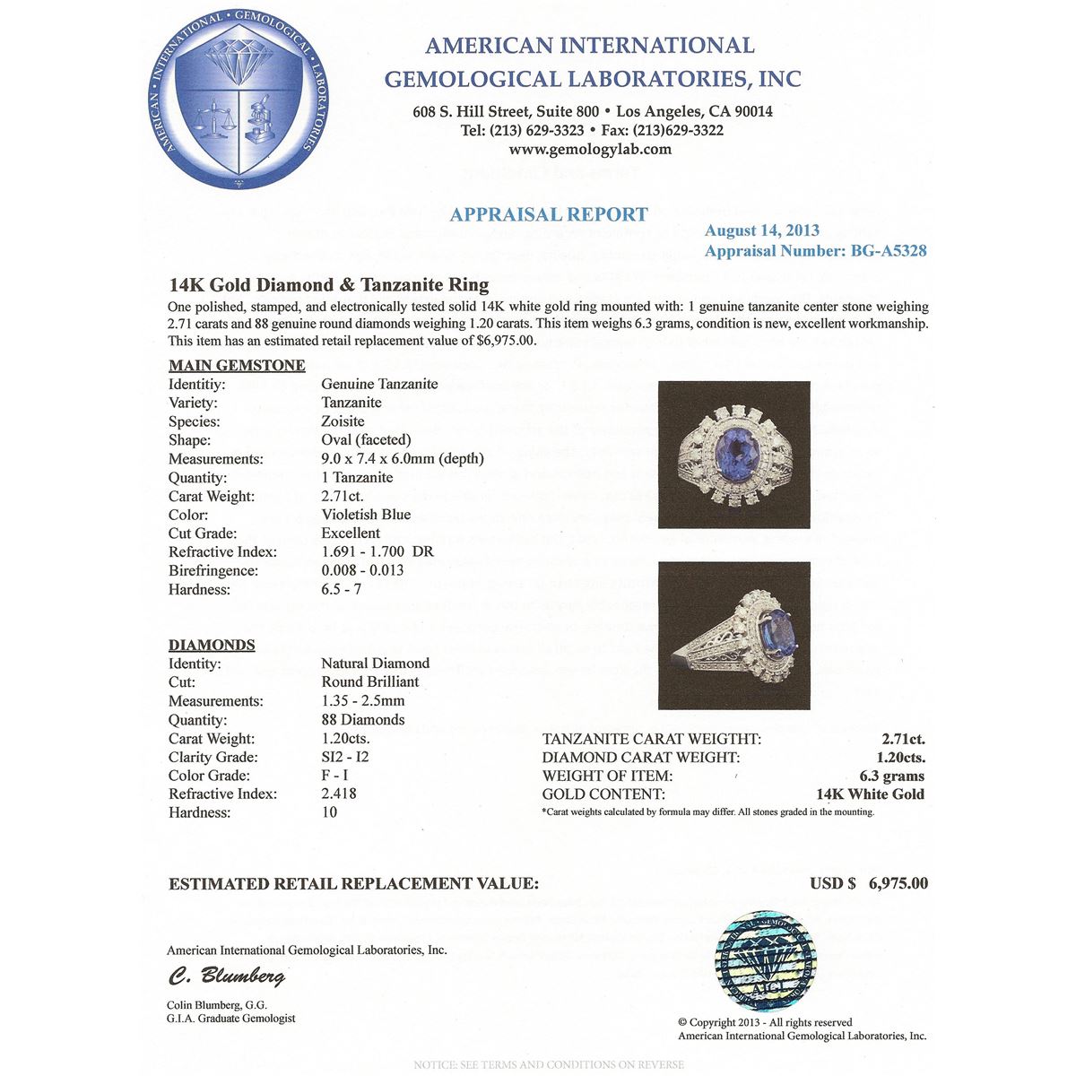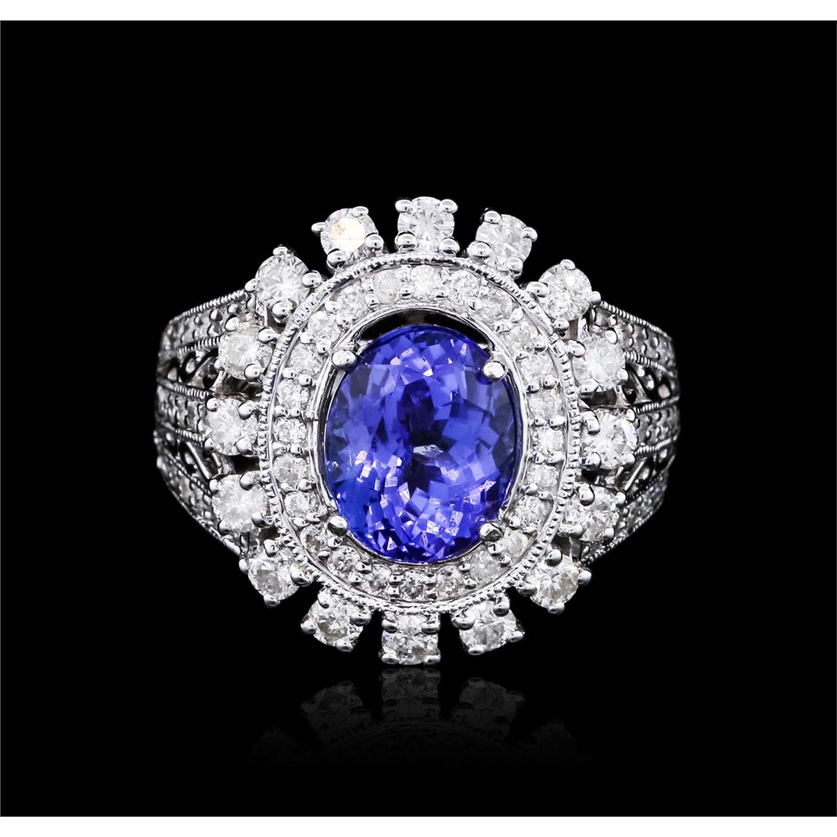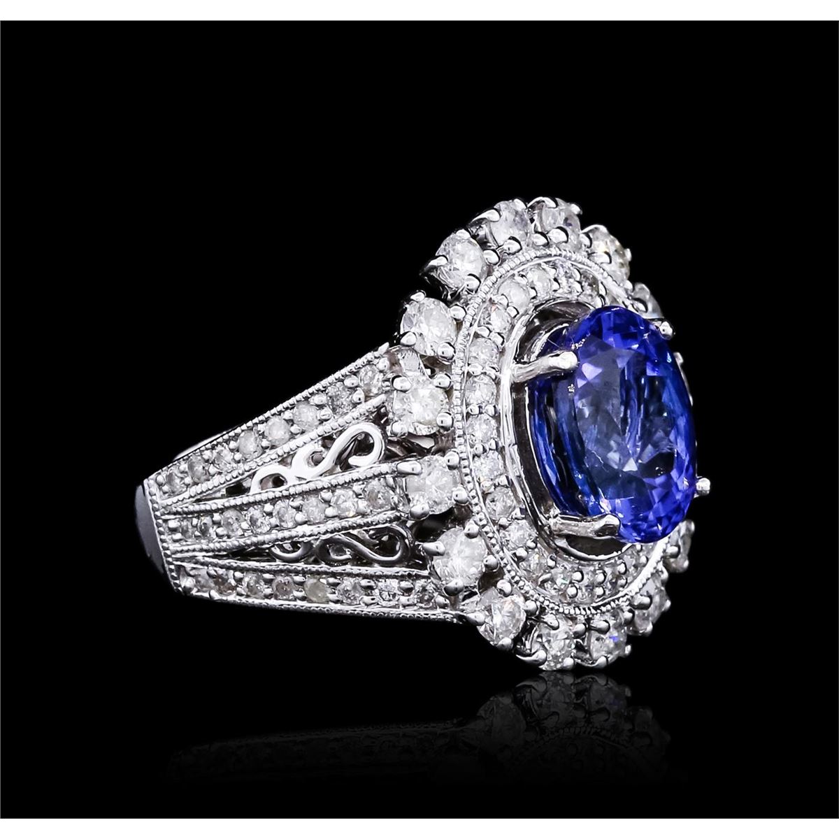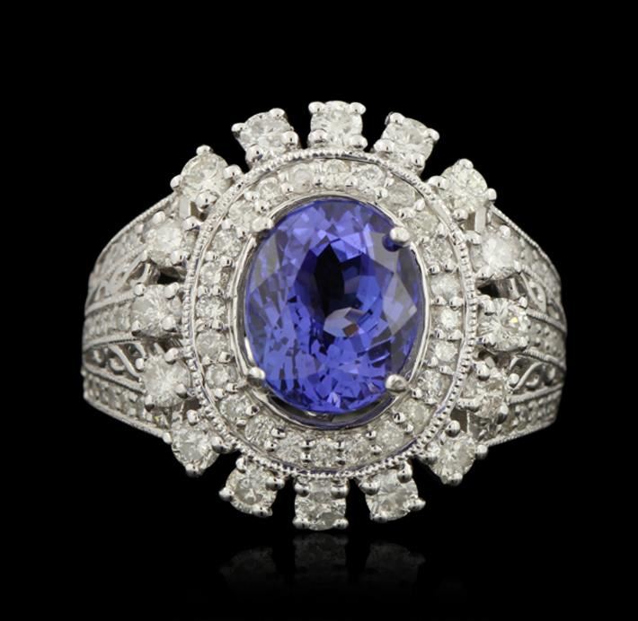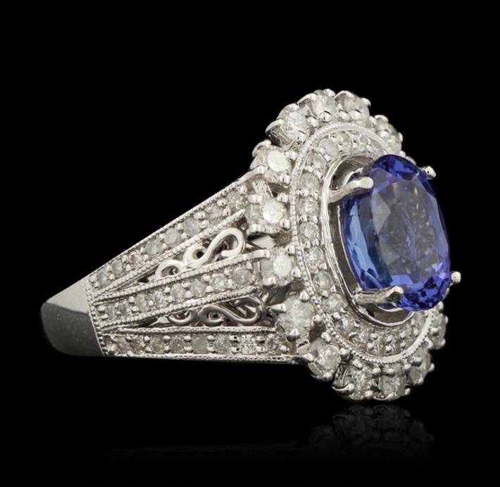 One polished, stamped, and electronically tested solid 14KT White Gold ring mounted with: 1 genuine tanzanite center stone weighing 2.71 carats and 88 genuine round diamonds weighing 1.20 carats. This item weighs 6.3 grams, condition is new, excellent workmanship. AIGL Appraised at $6,975.00.