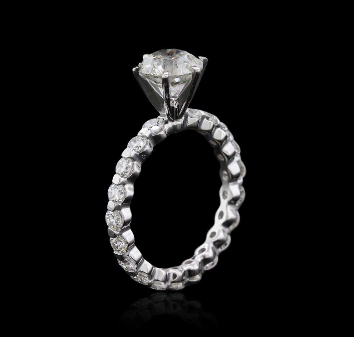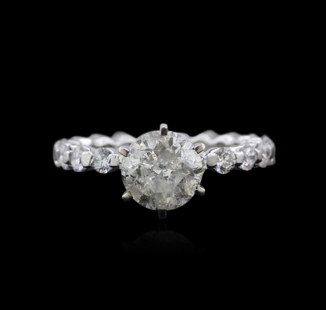 One electronically tested 14KT white gold ladies cast diamond engagement ring with a bright polish finish. Condition is very good. Containing: One prong set round brilliant cut diamond, measuring 7.50 - 7.40 x 5.20mm (depth est.) approximate weight of 1.76ct. Clarity: I-3. Color: J, Cut is Good. Twenty prong set round brilliant cut diamonds, measuring 2.40 - 2.30 x 1.41mm (depth est.) approximate. Total Weight of 20 Stones = 0.95ct. Clarity: SI-2 to I-2. Color: H - J, Cut is Very Good. All diamonds are graded in the mounting, unless otherwise stated. Total Weight of Diamonds 2.71ct. Total Weight of Engagement Ring 2.80 grams. GGL Appraised at $7,860.00.