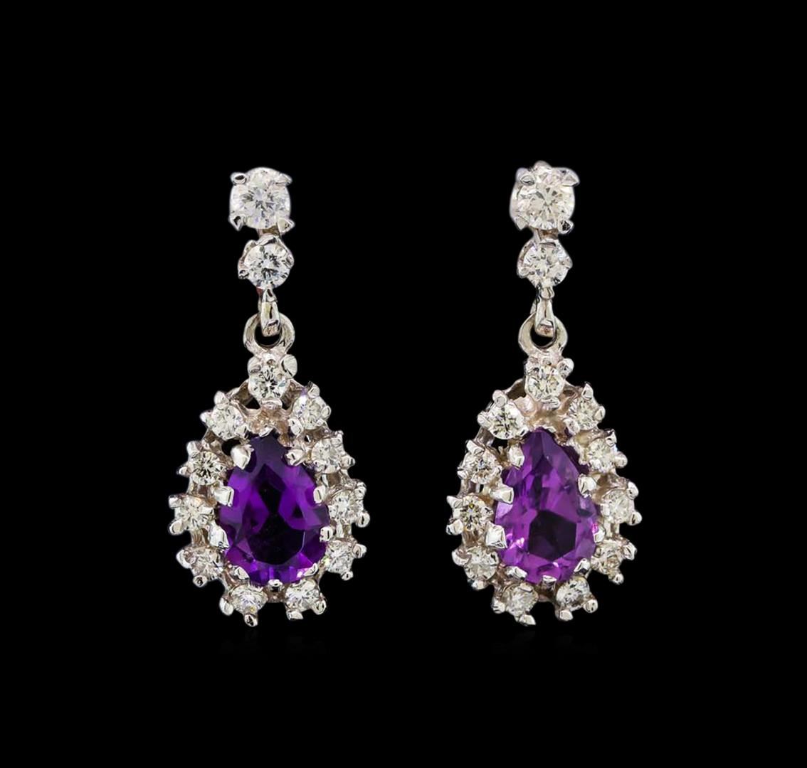 One pair electronically tested 14KT white gold ladies cast amethyst and diamond earrings with friction posts with a bright polish finish. Condition is new. Containing: Two prong set pear modified brilliant cut natural amethysts, measuring 8.50 x 6.80 x 4.42mm, approximate total weight of 2.72ct., clarity is eye clean, type II, medium, moderately strong, purple color, (GIA P 5/4), cut is good. Twenty-Six prong set round brilliant cut diamonds, measuring 3.00. - 2.00. x 1.50mm (depth est.) approximate total weight of 26 Stones = 1.00ct. Clarity: SI-2 to I-1. Color: H - I, Cut is Good. Colored gemstones are presumed to have been subjected to commonly used enhancement processes. All diamonds and colored gemstones are graded in the mounting, unless otherwise stated. Total Weight of Colored Stones 2.72ct. Total Weight of Diamonds 1.00ct. Total Weight of Earrings 5.30 grams. GGL Appraised at $3,185.00.