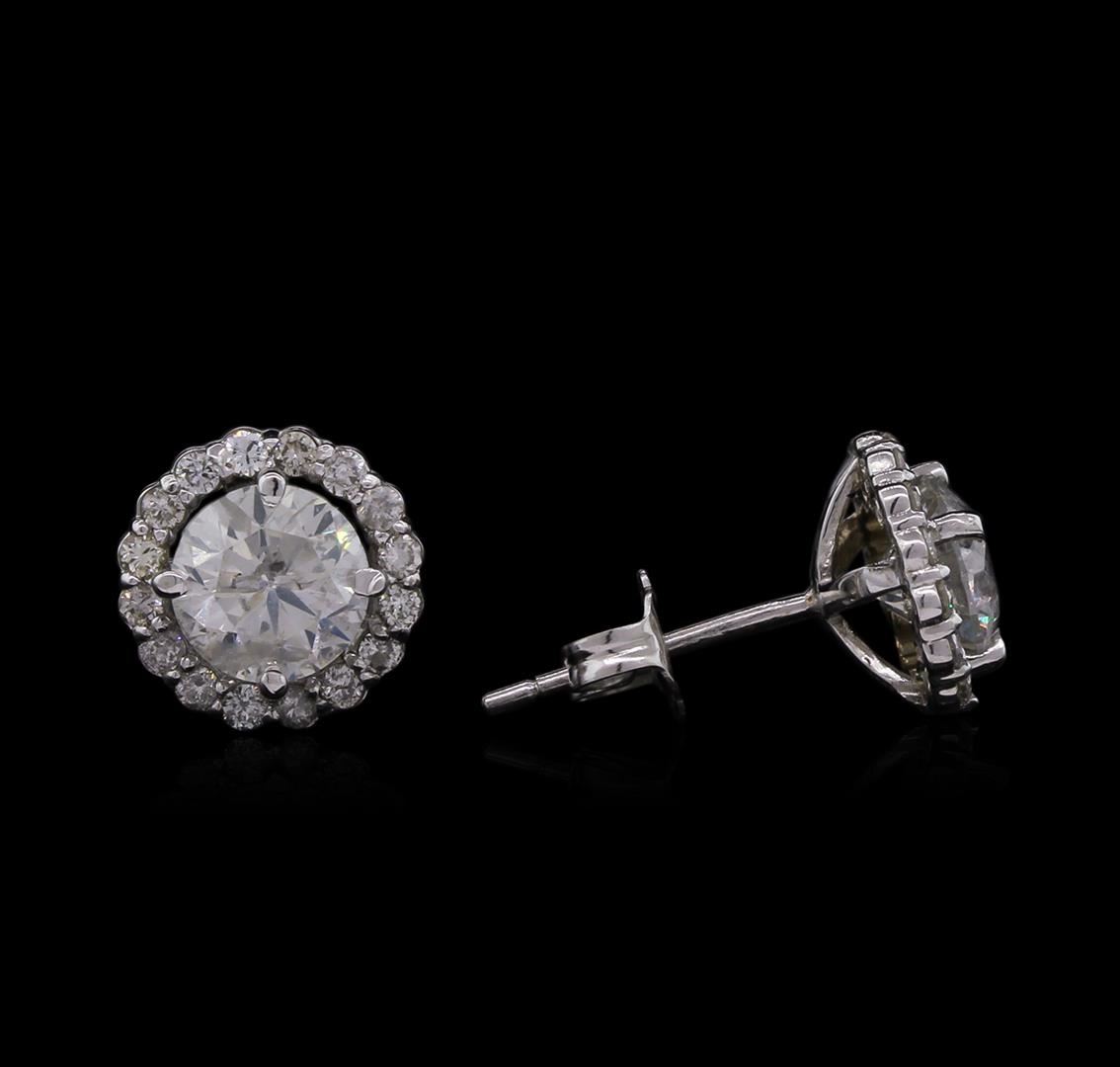 One pair electronically tested 14KT White Gold ladies cast & assembled diamond earrings with standard backs. Condition is good. Bright polish finish. Identified with markings of "585". Containing: Two prong set round brilliant cut diamonds, measuring 6.60 - 6.50 x 3.93mm (depth est.) approximate. Total Weight of 2 Stones = 2.24ct. The color grade reflects the average for the pair. Graded in the setting. Clarity: I-1 to I-2. Color: I. Thirty-Two prong set round brilliant cut diamonds, measuring 1.50 - 1.40 x 0.87mm (depth est.) approximate. Total Weight of 32 Stones = 0.49ct. Graded in the setting. Clarity: SI-2 to I-1. Color: H - I. Total Weight of Diamonds 2.73ct. AIG Appraised at $29,575.00.