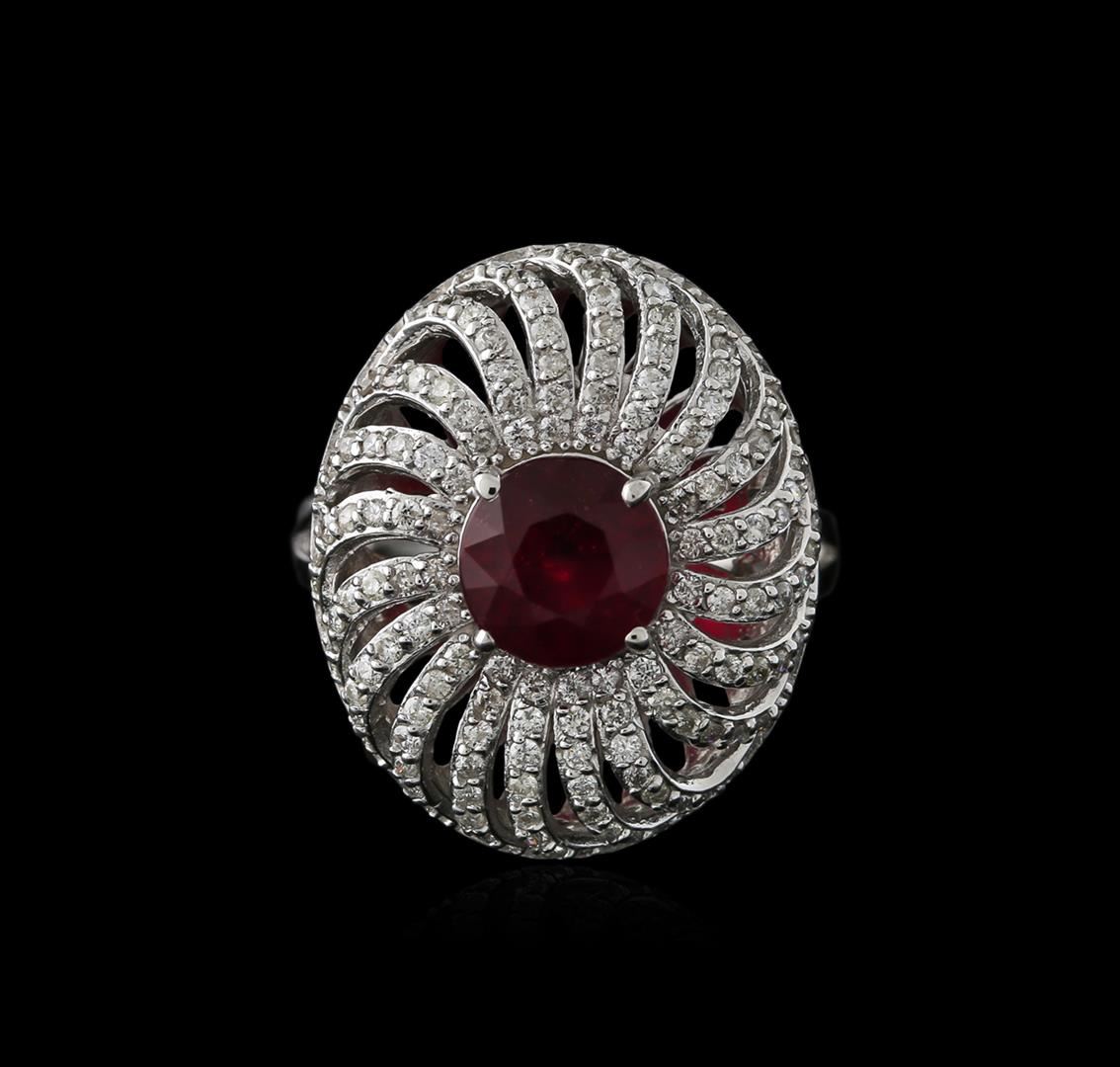 One electronically tested 14KT white gold ladies cast ruby and diamond ring with a bright polish finish. Identified with markings of "K14". Condition is new. Containing: One prong set round modified brilliant cut ruby, measuring 7.50 - 7.50 x 4.88 mm, approximate weight of 2.73ct., clarity is heavily included, type II, medium, very slightly brownish, strongly purplish red color, (GIA stpR 5/3), cut is good. One Hundred Sixty prong set round brilliant cut diamonds, measuring 1.10 - 1.10 x 0.66mm (depth est.) approximate total weight of 160 Stones = 0.98ct. Clarity: I-1 to I-2. Color: H - I, Cut is Good. Colored gemstones are presumed to have been subjected to commonly used enhancement processes. All diamonds and colored gemstones are graded in the mounting, unless otherwise stated. Total Weight of Colored Stones 2.73ct. Total Weight of Diamonds 0.98ct. Total Weight of Ring 8.30 grams. GGL Appraised at $3,690.00.