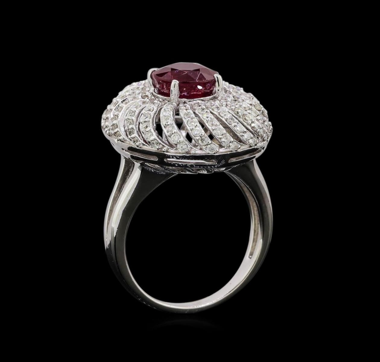 One electronically tested 14KT white gold ladies cast ruby and diamond ring with a bright polish finish. Identified with markings of "K14". Condition is new. Containing: One prong set round modified brilliant cut ruby, measuring 7.50 - 7.50 x 4.88 mm, approximate weight of 2.73ct., clarity is heavily included, type II, medium, very slightly brownish, strongly purplish red color, (GIA stpR 5/3), cut is good. One Hundred Sixty prong set round brilliant cut diamonds, measuring 1.10 - 1.10 x 0.66mm (depth est.) approximate total weight of 160 Stones = 0.98ct. Clarity: I-1 to I-2. Color: H - I, Cut is Good. Colored gemstones are presumed to have been subjected to commonly used enhancement processes. All diamonds and colored gemstones are graded in the mounting, unless otherwise stated. Total Weight of Colored Stones 2.73ct. Total Weight of Diamonds 0.98ct. Total Weight of Ring 8.30 grams. GGL Appraised.
