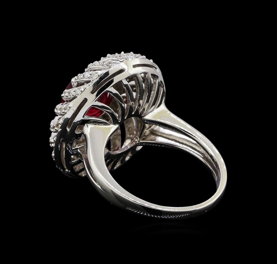 One electronically tested 14KT white gold ladies cast ruby and diamond ring with a bright polish finish. Identified with markings of "K14". Condition is new. Containing: One prong set round modified brilliant cut ruby, measuring 7.50 - 7.50 x 4.88 mm, approximate weight of 2.73ct., clarity is heavily included, type II, medium, very slightly brownish, strongly purplish red color, (GIA stpR 5/3), cut is good. One Hundred Sixty prong set round brilliant cut diamonds, measuring 1.10 - 1.10 x 0.66mm (depth est.) approximate total weight of 160 Stones = 0.98ct. Clarity: I-1 to I-2. Color: H - I, Cut is Good. Colored gemstones are presumed to have been subjected to commonly used enhancement processes. All diamonds and colored gemstones are graded in the mounting, unless otherwise stated. Total Weight of Colored Stones 2.73ct. Total Weight of Diamonds 0.98ct. Total Weight of Ring 8.30 grams. GGL Appraised.