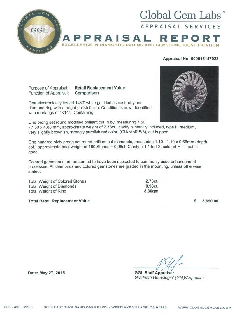 One electronically tested 14KT white gold ladies cast ruby and diamond ring with a bright polish finish. Identified with markings of "K14". Condition is new. Containing: One prong set round modified brilliant cut ruby, measuring 7.50 - 7.50 x 4.88 mm, approximate weight of 2.73ct., clarity is heavily included, type II, medium, very slightly brownish, strongly purplish red color, (GIA stpR 5/3), cut is good. One Hundred Sixty prong set round brilliant cut diamonds, measuring 1.10 - 1.10 x 0.66mm (depth est.) approximate total weight of 160 Stones = 0.98ct. Clarity: I-1 to I-2. Color: H - I, Cut is Good. Colored gemstones are presumed to have been subjected to commonly used enhancement processes. All diamonds and colored gemstones are graded in the mounting, unless otherwise stated. Total Weight of Colored Stones 2.73ct. Total Weight of Diamonds 0.98ct. Total Weight of Ring 8.30 grams. GGL Appraised at $3,690.00.