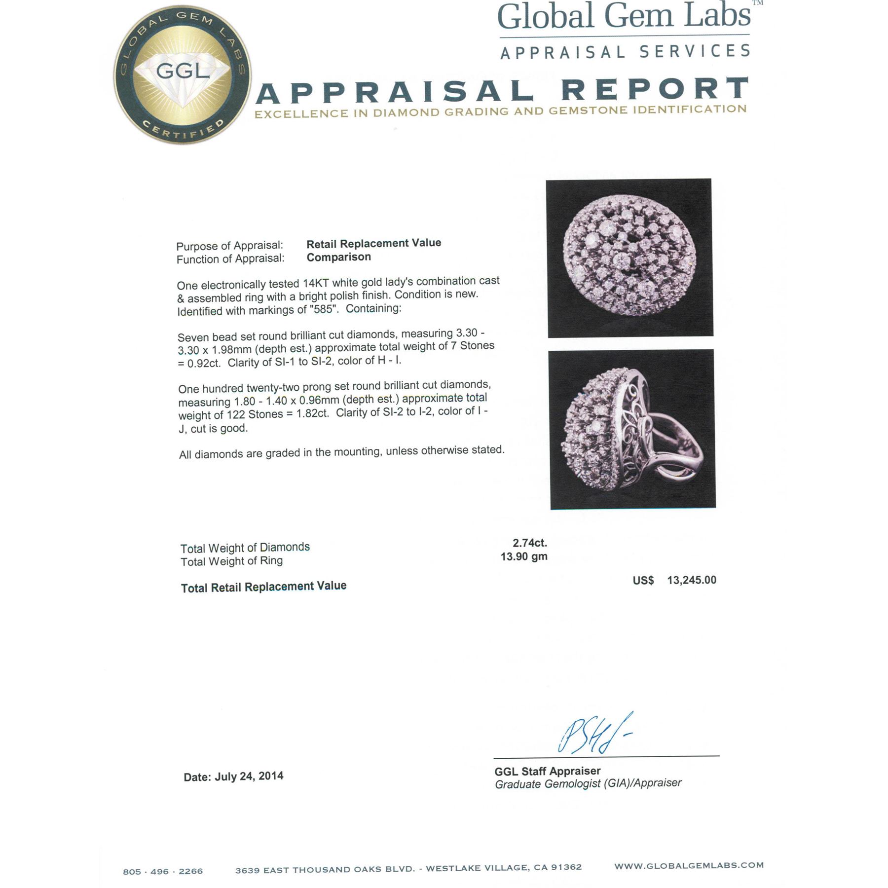 One electronically tested 14KT white gold ladies combination cast & assembled ring with a bright polish finish. Condition is new. Identified with markings of "585". Containing: Seven bead set round brilliant cut diamonds, measuring 3.30 - 3.30 x 1.98mm (depth est.) approximate total weight of 7 Stones = 0.92ct. Clarity: SI-1 to SI-2. Color: H - I. One Hundred Twenty-Two prong set round brilliant cut diamonds, measuring 1.80 - 1.40 x 0.96mm (depth est.) approximate total weight of 122 Stones = 1.82ct. Clarity: SI-2 to I-2. Color: I - J, Cut is Good. All diamonds are graded in the mounting, unless otherwise stated. Total Weight of Diamonds 2.74ct. Total Weight of Ring 13.90 grams. GGL Appraised at $13,245.00.