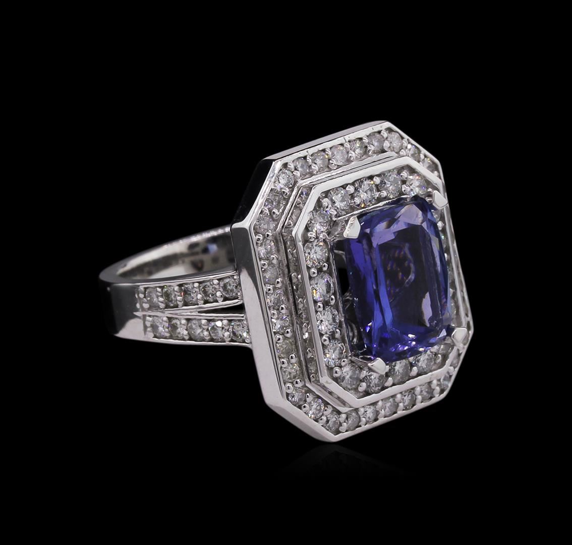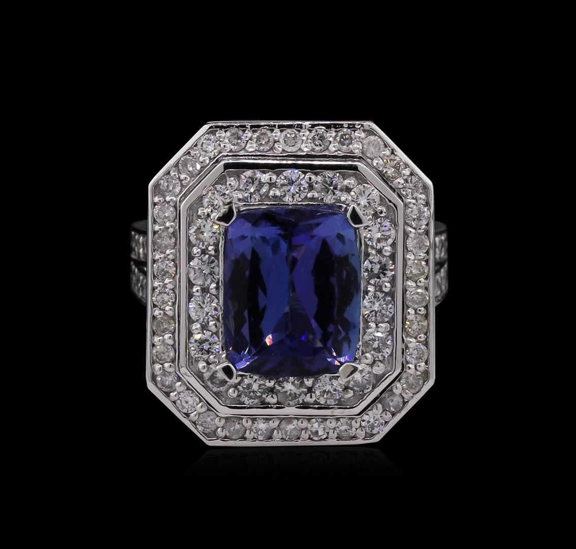 One electronically tested 14KT white gold Ladies combination cast & assembled ring with a bright polish finish. Condition is new. Identified with markings of "14K". Containing: One prong set rectangular cushion modified brilliant cut natural tanzanite, measuring 10.00 x 8.10 x 4.30mm, approximate weight of 2.74ct., clarity is eye clean, type I, medium light, very slightly grayish, violet color, (GIA V 4/3), cut is good. Colored gemstones are presumed to have been subjected to commonly used color/clarity enhancement processes. Seventy-Two prong set round brilliant cut diamonds, measuring 1.80 - 1.50 x 0.99mm (depth est.) approximate. Total Weight of 72 Stones = 1.18ct. Clarity: I-1 to I-2. Color: I - J, Cut is Good. Total Weight of Colored Stones 2.74ct. Total Weight of Diamonds 1.18ct. Total Weight of Ring 12.50 grams. GGL Appraised at $10,705.00.