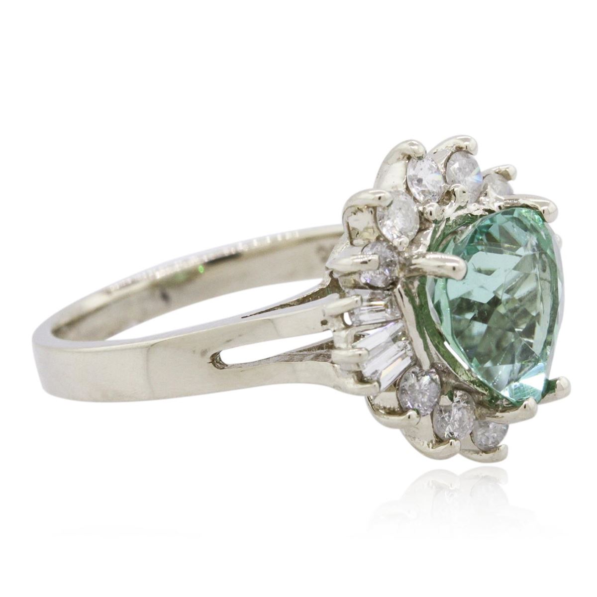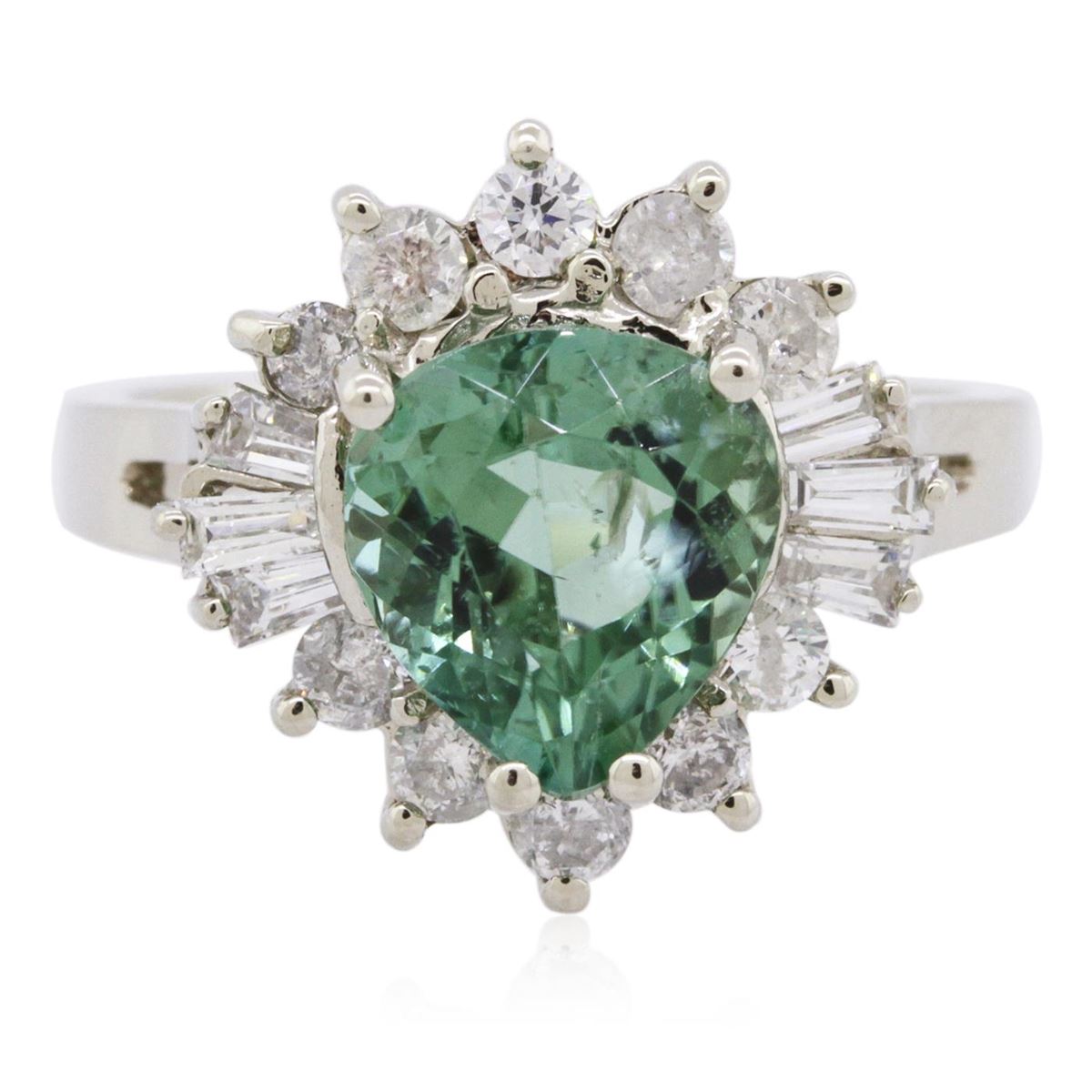 One electronically tested 14KT white gold ladies cast green tourmaline and diamond ring with a bright polish finish. The featured green tourmaline is set within a stylized diamond bezel, completed by a two and one-half millimeter wide band. Identified with markings of "K14". Condition is new, good workmanship. Containing: One prong set pear mixed cut natural green tourmaline, measuring 8.90 x 8.15 x 5.60mm, 6%. bulge factor, approximate weight of 2.74ct., clarity is slightly included, type I, medium, moderately strong, very slightly bluish green color, (GIA vslbG 5/4), cut is good. Transmitting light with a minimum of distortion, transparent. Naturally occurring internal & external characteristics are present. Refractive index testing results of 1.62 to 1.64. This is a conclusive result for tourmaline. Graded in the setting. Ten prong set round brilliant cut diamonds, measuring 2.40 - 2.30 x 1.41mm (depth est.) approximate total weight of 10 Stones = 0.57ct. Graded in the setting. Clarity: I-1 to I-2. Color: H - J Six channel set baguette cut (tapered) diamonds, measuring from 2.90 x 1.30 x 0.91mm (depth est.) to 3.10 x 1.50 x 1.05mm (depth est.) approximate total weight of 6 Stones = 0.25ct. Graded in the setting. Clarity: VS-2 to SI-1. Color: G - H. Total Weight of Colored Stones 2.74ct. Total Weight of Diamonds 0.82ct. Total Weight of Ring 5.03 grams. AIG Appraised at $6,405.00.