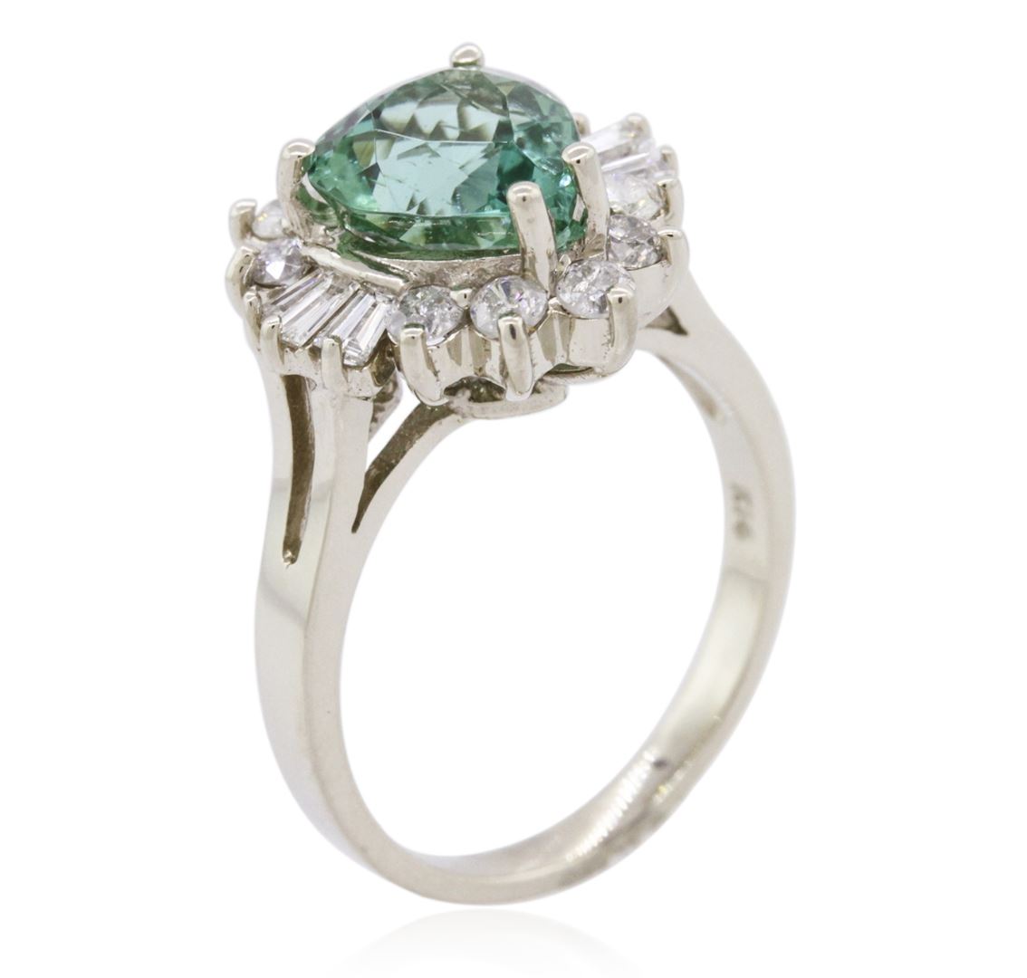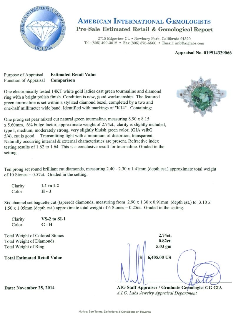 One electronically tested 14KT white gold ladies cast green tourmaline and diamond ring with a bright polish finish. The featured green tourmaline is set within a stylized diamond bezel, completed by a two and one-half millimeter wide band. Identified with markings of "K14". Condition is new, good workmanship. Containing: One prong set pear mixed cut natural green tourmaline, measuring 8.90 x 8.15 x 5.60mm, 6%. bulge factor, approximate weight of 2.74ct., clarity is slightly included, type I, medium, moderately strong, very slightly bluish green color, (GIA vslbG 5/4), cut is good. Transmitting light with a minimum of distortion, transparent. Naturally occurring internal & external characteristics are present. Refractive index testing results of 1.62 to 1.64. This is a conclusive result for tourmaline. Graded in the setting. Ten prong set round brilliant cut diamonds, measuring 2.40 - 2.30 x 1.41mm (depth est.) approximate total weight of 10 Stones = 0.57ct. Graded in the setting. Clarity: I-1 to I-2. Color: H - J Six channel set baguette cut (tapered) diamonds, measuring from 2.90 x 1.30 x 0.91mm (depth est.) to 3.10 x 1.50 x 1.05mm (depth est.) approximate total weight of 6 Stones = 0.25ct. Graded in the setting. Clarity: VS-2 to SI-1. Color: G - H. Total Weight of Colored Stones 2.74ct. Total Weight of Diamonds 0.82ct. Total Weight of Ring 5.03 grams. AIG Appraised at $6,405.00.