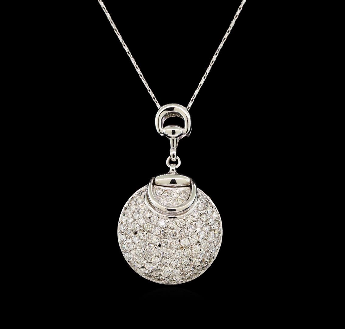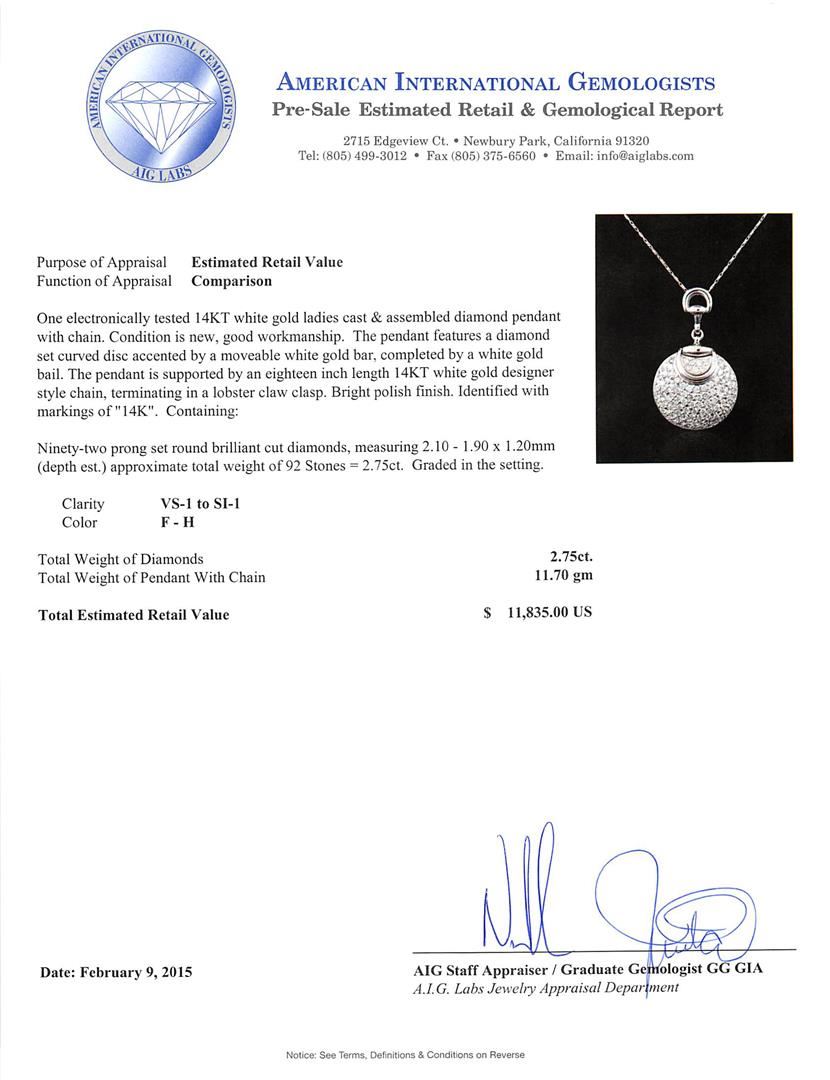 One electronically tested 14KT white gold ladies cast & assembled diamond pendant with chain. The pendant features a diamond set curved disc accented by a moveable white gold bar, completed by a white gold bail. The pendant is supported by an eighteen inch length 14KT white gold designer style chain, terminating in a lobster claw clasp. Bright polish finish. Identified with markings of "14K". Condition is new, good workmanship. Containing: Ninety-Two prong set round brilliant cut diamonds, measuring 2.10 - 1.90 x 1.20mm (depth est.) approximate total weight of 92 Stones = 2.75ct. Graded in the setting. Clarity: VS-1 to SI-1. Color: F - H. Total Weight of Diamonds 2.75ct. Total Weight of Pendant With Chain 11.70 grams. AIG Appraised.