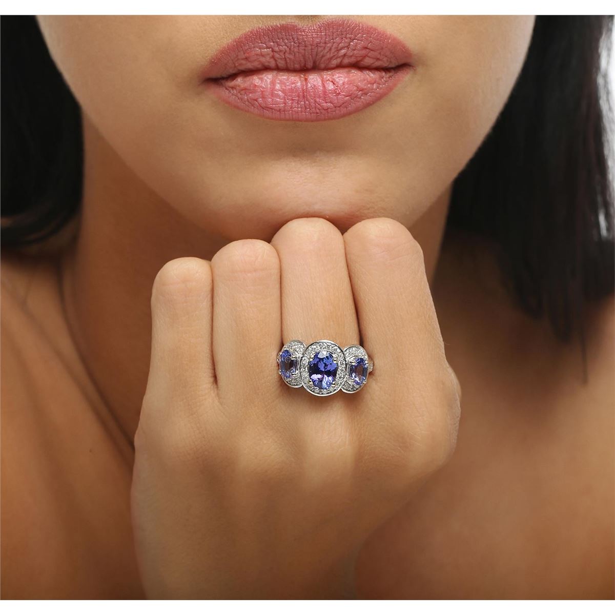 One electronically tested 14KT white gold ladies combination cast & assembled ring with a bright polish finish. Condition is new. Identified with markings of "14K". Containing: One prong set oval modified brilliant cut natural tanzanite, measuring 8.51 x 6.14 x 4.42mm, approximate weight of 1.59ct., clarity is eye clean, type I, medium, moderately strong, violetish blue color, (GIA vB 5/4), cut is good. Two prong set oval modified brilliant cut natural tanzanites, measuring 6.11 x 4.19 x 3.29mm, approximate. Total Weight of 1.16ct., clarity is eye clean, type I, medium, moderately strong, bluish violet color, (GIA bV 5/4), cut is good. Forty-Six prong set round brilliant cut diamonds, measuring 1.50 - 1.50 x 0.90mm (depth est.) approximate. Total Weight of 46 Stones = 0.57ct. Clarity: I-1 to I-2. Color: H - I, Cut is Good. Colored gemstones are presumed to have been subjected to commonly used enhancement processes. All diamonds and colored gemstones are graded in the mounting, unless otherwise stated. Total Weight of Colored Stones 2.75ct. Total Weight of Diamonds 0.57ct. Total Weight of Ring 7.30 grams. GGL Appraised at $7,555.00.