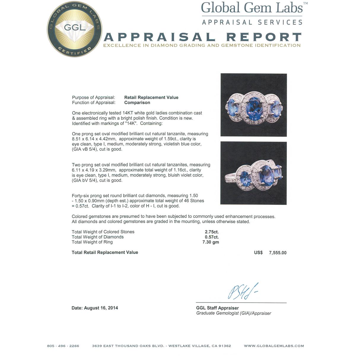 One electronically tested 14KT white gold ladies combination cast & assembled ring with a bright polish finish. Condition is new. Identified with markings of "14K". Containing: One prong set oval modified brilliant cut natural tanzanite, measuring 8.51 x 6.14 x 4.42mm, approximate weight of 1.59ct., clarity is eye clean, type I, medium, moderately strong, violetish blue color, (GIA vB 5/4), cut is good. Two prong set oval modified brilliant cut natural tanzanites, measuring 6.11 x 4.19 x 3.29mm, approximate. Total Weight of 1.16ct., clarity is eye clean, type I, medium, moderately strong, bluish violet color, (GIA bV 5/4), cut is good. Forty-Six prong set round brilliant cut diamonds, measuring 1.50 - 1.50 x 0.90mm (depth est.) approximate. Total Weight of 46 Stones = 0.57ct. Clarity: I-1 to I-2. Color: H - I, Cut is Good. Colored gemstones are presumed to have been subjected to commonly used enhancement processes. All diamonds and colored gemstones are graded in the mounting, unless otherwise stated. Total Weight of Colored Stones 2.75ct. Total Weight of Diamonds 0.57ct. Total Weight of Ring 7.30 grams. GGL Appraised at $7,555.00.