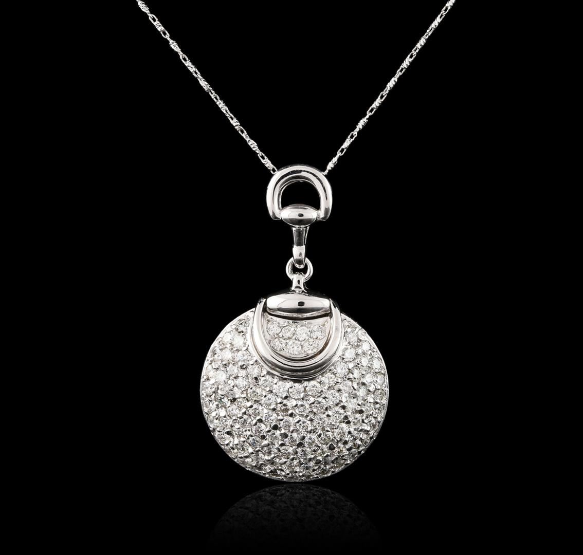 One electronically tested 14KT white gold ladies cast & assembled diamond pendant with chain. The pendant features a diamond set curved disc accented by a moveable white gold bar, completed by a white gold bail. The pendant is supported by an eighteen inch length 14KT white gold designer style chain, terminating in a lobster claw clasp. Bright polish finish. Identified with markings of "14K". Condition is new, good workmanship. Containing: Ninety-Two prong set round brilliant cut diamonds, measuring 2.10 - 1.90 x 1.20mm (depth est.) approximate total weight of 92 Stones = 2.75ct. Graded in the setting. Clarity: VS-1 to SI-1. Color: F - H. Total Weight of Diamonds 2.75ct. Total Weight of Pendant With Chain 11.70 grams. AIG Appraised at $11,835.00.
