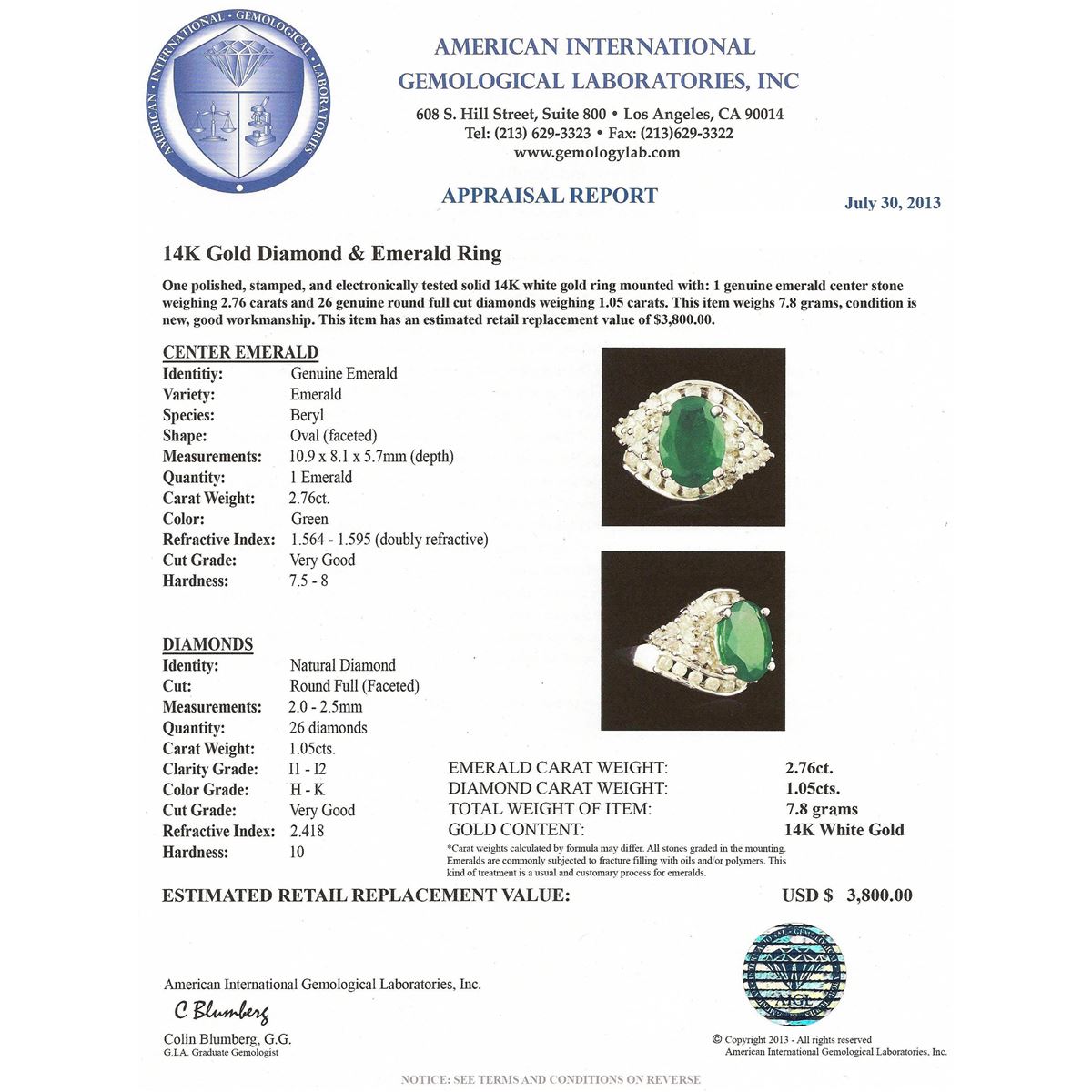 One polished, stamped, and electronically tested solid 14KT White Gold ring mounted with: 1 genuine emerald center stone weighing 2.76 carats and 26 genuine round full cut diamonds weighing 1.05 carats. This item weighs 7.8 grams, condition is new, very good workmanship. AIGL Appraised at $3,800.00.