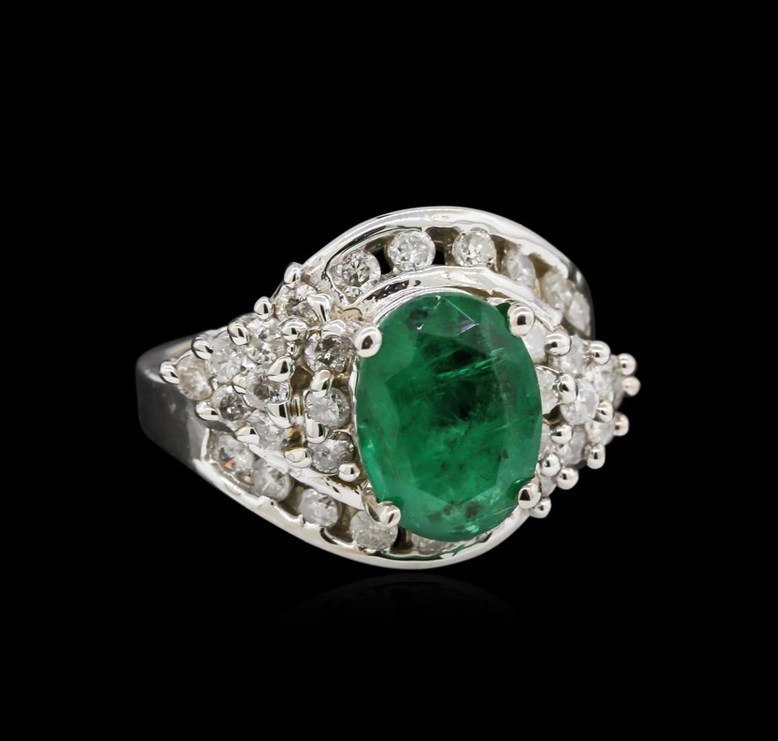 One polished, stamped, and electronically tested solid 14KT White Gold ring mounted with: 1 genuine emerald center stone weighing 2.76 carats and 26 genuine round full cut diamonds weighing 1.05 carats. This item weighs 7.8 grams, condition is new, very good workmanship. AIGL Appraised at $3,800.00.