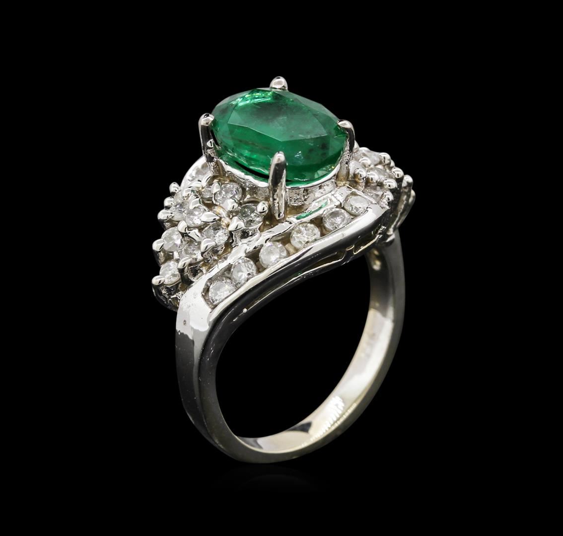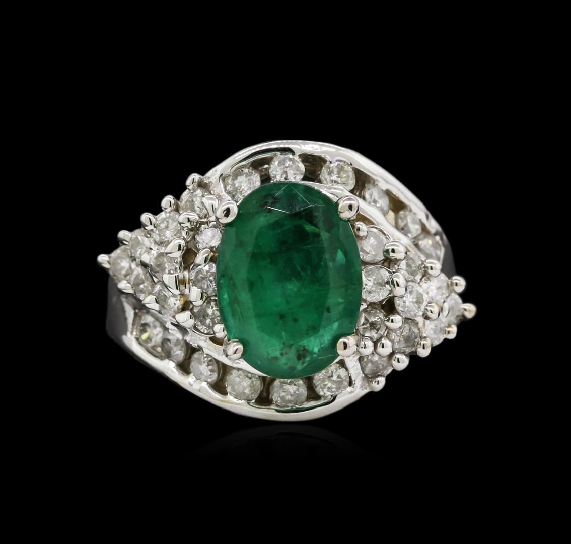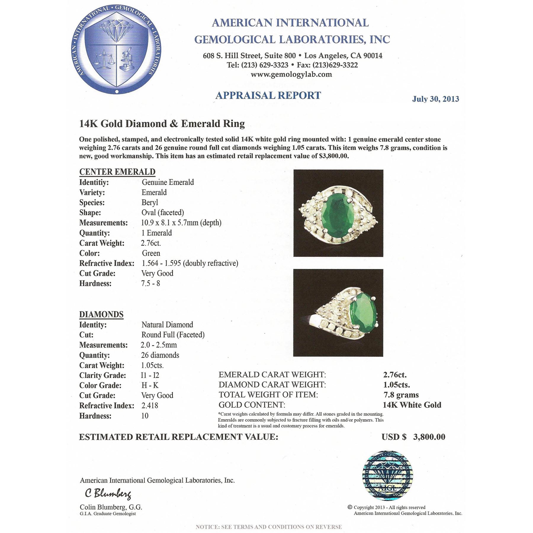 One polished, stamped, and electronically tested solid 14KT White Gold ring mounted with: 1 genuine emerald center stone weighing 2.76 carats and 26 genuine round full cut diamonds weighing 1.05 carats. This item weighs 7.8 grams, condition is new, very good workmanship. AIGL Appraised at $3,800.00.