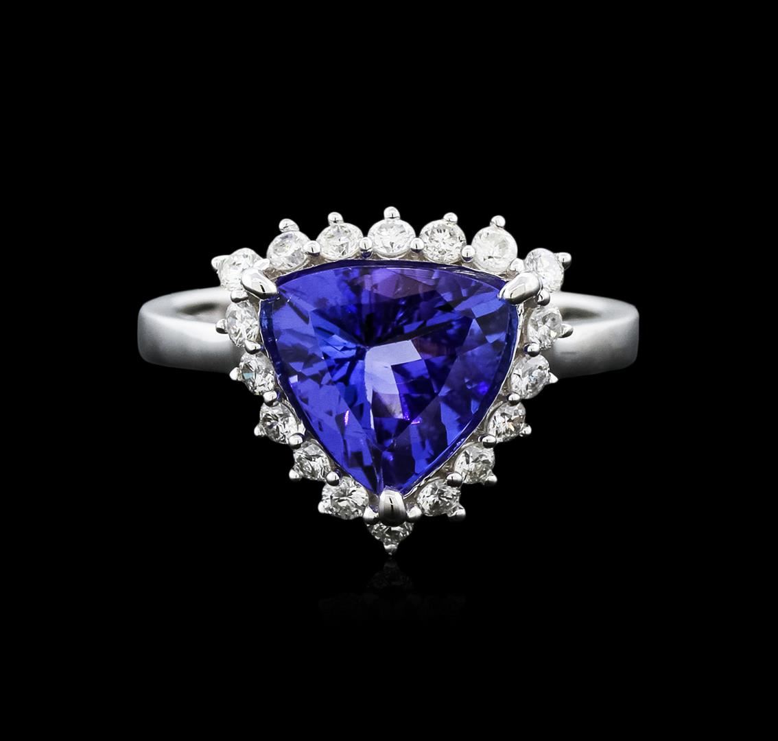 One electronically tested 14KT white gold ladies cast tanzanite and diamond ring with a cathedral shank with a bright polish finish. Trademark is Orianne. Identified with markings of "14K". Condition is new. Containing: One prong set triangle modified brilliant cut natural tanzanite, measuring 10.00 x 10.00 x 4.58mm, approximate weight of 2.76ct., clarity is eye clean, type I, medium light, very slightly grayish, violet color, (GIA V 4/3), cut is good. Eighteen prong set round brilliant cut diamonds, measuring 1.50 - 1.50 x 0.90mm (depth est.) approximate total weight of 18 Stones = 0.22ct. Clarity: SI-2 to I-1. Color: I - J, Cut is Good. All diamonds and colored gemstones are graded in the mounting, unless otherwise stated. Colored gemstones are presumed to have been subjected to commonly used enhancement processes. Total Weight of Colored Stones 2.76ct. Total Weight of Diamonds 0.22ct. Total Weight of Ring 3.10 grams. GGL Appraised at $3,495.00.