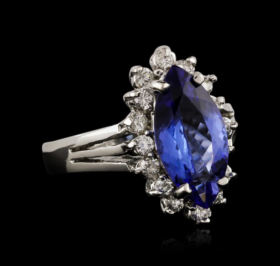 One electronically tested 14KT white gold ladies cast tanzanite and diamond ring with a bright polish finish. Identified with markings of "K14". Condition is new. Containing: One prong set marquise modified brilliant cut natural tanzanite, measuring 14.00 x 7.20 x 4.30mm, approximate weight of 2.76ct., clarity is eye clean, type I, medium, very slightly grayish, bluish violet color, (GIA bV 5/3), cut is good. Sixteen prong set round brilliant cut diamonds, measuring 2.00 - 2.00 x 1.20mm (depth est.) approximate total weight of 16 Stones = 0.47ct. Clarity: SI-1 to SI-2. Color: I - J, Cut is Good. Colored gemstones are presumed to have been subjected to commonly used enhancement processes. All diamonds and colored gemstones are graded in the mounting, unless otherwise stated. Total Weight of Colored Stones 2.76ct. Total Weight of Diamonds 0.47ct. Total Weight of Ring 5.20 grams. GGL Appraised at $4,000.00.